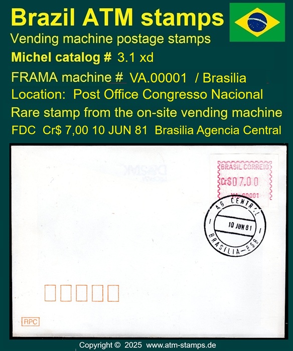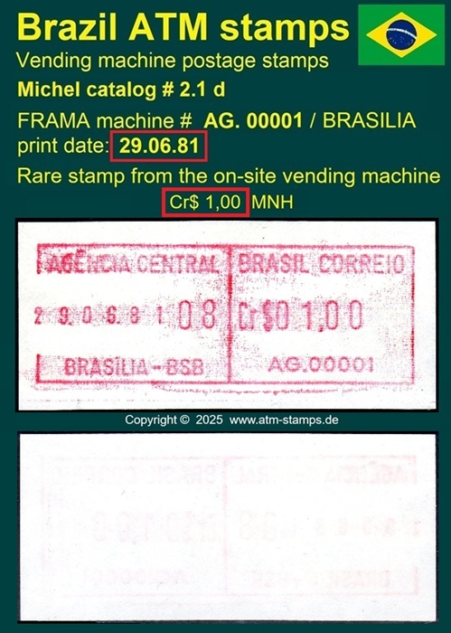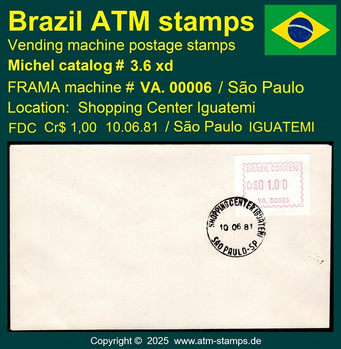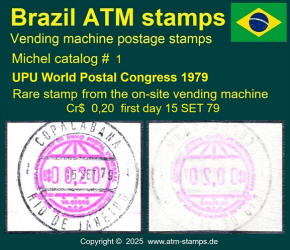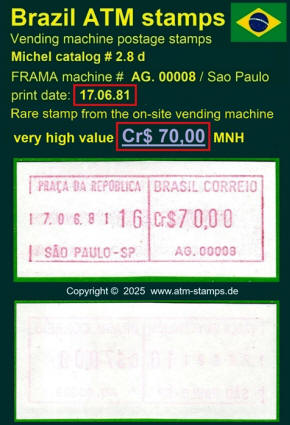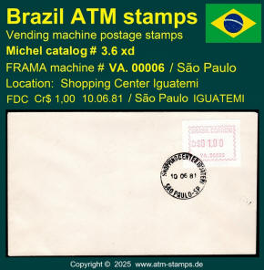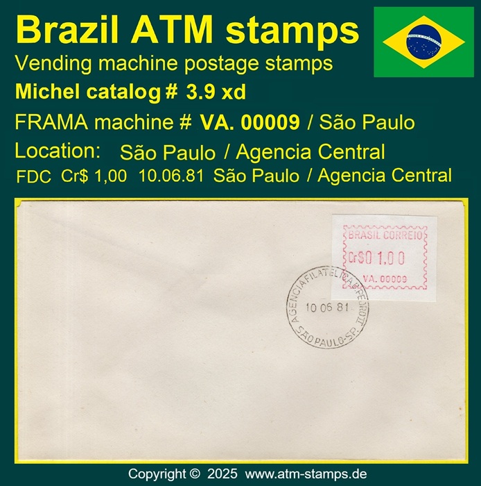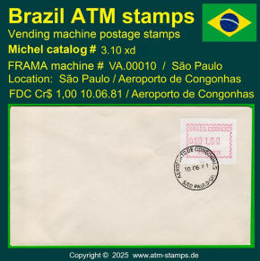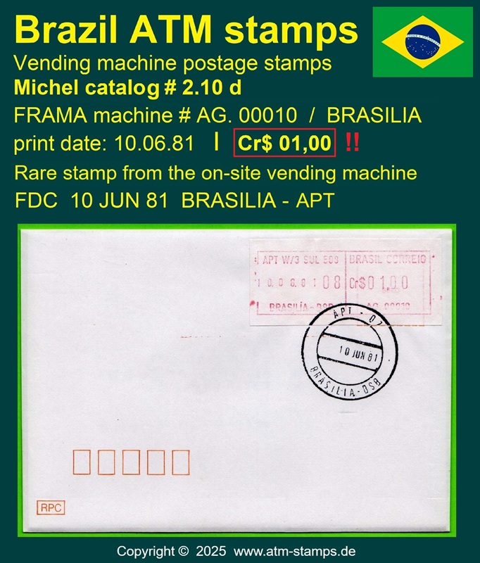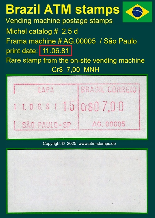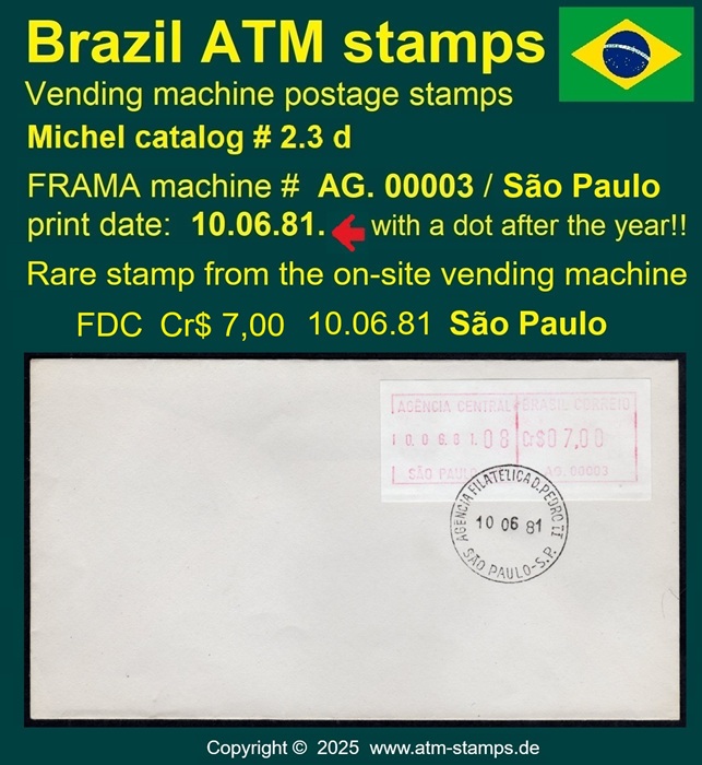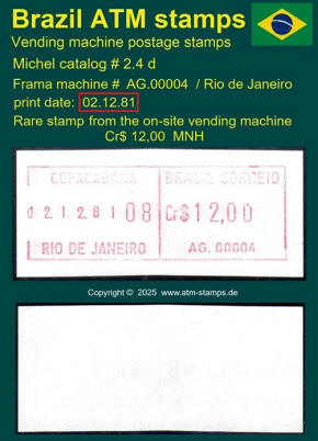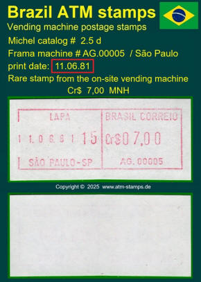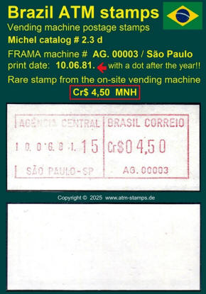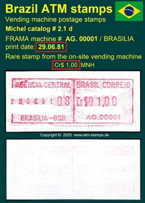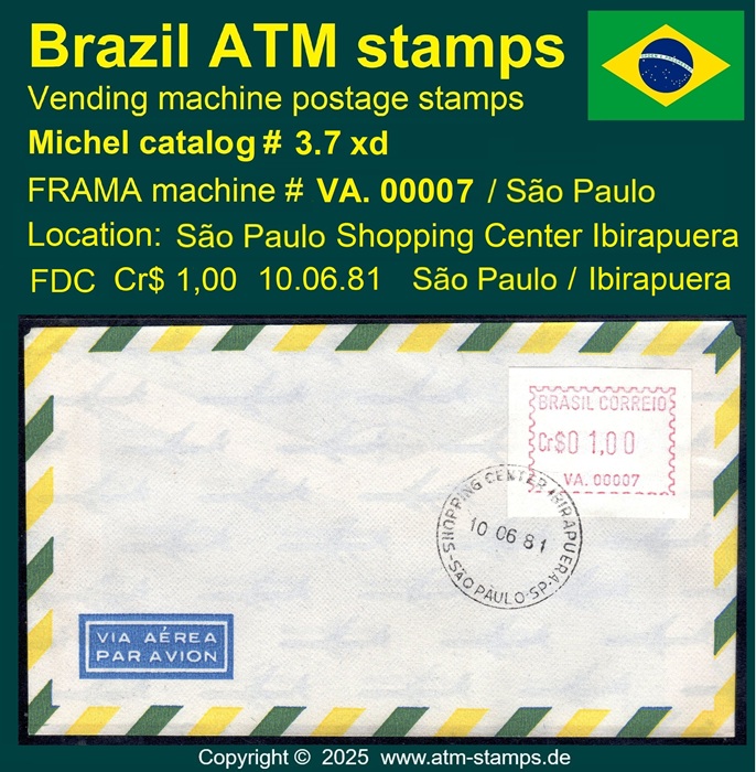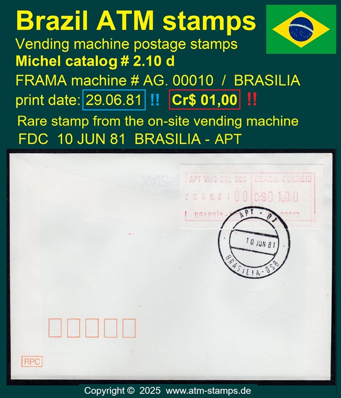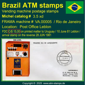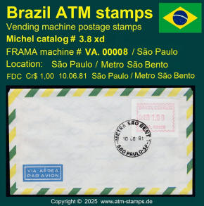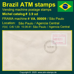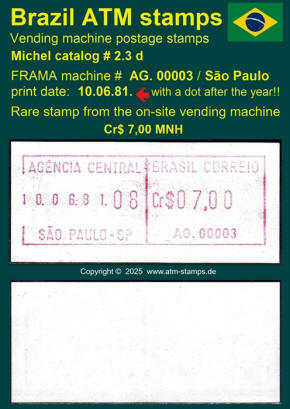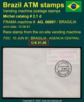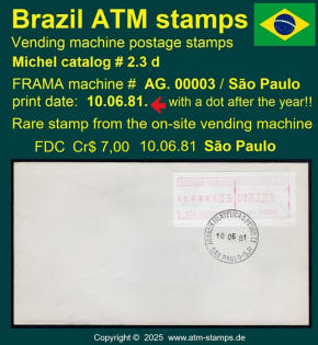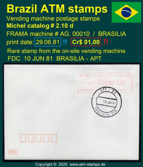 Die Postverwaltung von Brasilien nahm am 10.06.1981 insgesamt 10 Schalterwertzeichendrucker mit Automatennummern AG.00001 - AG.00010 der schweizer Firma Frama vom Typ SG15 in Brasilia, Rio de Janeira und São Paulo in Betrieb. Die Postverwaltung erklärte diese Postwertzeichen trotz aufgedrucktem Datum zu uneingeschränkt gültigen Briefmarken. Im amtlichen Erlass vom 10.6.1981 wird speziell darauf hingewiesen, dass die Marken jederzeit und überall in Brasilien verwendet werden durften und abgestempelt werden mussten. Das aufgedruckte Datum blieb unberücksichtigt. Die Marken waren dem Kunden abzugeben, damit er diese benutzen konnte, wann und wo er wollte. Die Geräte hatten grundsätzlich ein Wertespektrum von 0,01 - 99,99 (Cr$) in Stufen von 0,01 (Cr$) wobei die Postverwaltung den Mindestabgabe-Nennwert auf 7,00 (Cr$) festgelegt hatte. Bei der Versandstelle der Post waren die ATM nur in den Wertstufen 7,00 (Cr$) und 12,00 (Cr$) erhältlich, amtliche Ersttagsbelege / FDC wurden nicht angeboten. Die in den Geräten eingesetzten weißen Papierrollen (Papier rau / dunkle Fluoreszenz) wurden wahrscheinlich auch von der Firma Frama geliefert. Bei dieser Ausgabe gibt es sehr starke Farbband-Tönungen. Die dunkelrotlila Tönung ist bei ATM aus den Ortsgeräten typisch. Alle Marken mit Druckdatum 11.6.1981 – 28.12.1981 stammen von den Ortsautomaten und alle Werte außer 7,00 und 12,00 Cr$ stammen ebenfalls aus Ortsautomaten, da die Versandstelle nur die Wertstufen 7,00 und 12,00 Cr$ und immer mit dem Druckdatum 10.6.1981 (Ersttag) ausgeliefert hat. Das Porto für einen Inlandbrief betrug 7,00 Cr$ vom Ersttag 10.06.1981 – 17.07.1981, dann 12,00 Cr$ vom 18.7.1981 – 28.2.1982. Briefe mit ATM der Versandstelle sind oft nicht portogerecht frankiert. Die ATM der Versandstelle im Farbton Rotorange (in der Farbgruppe bräunlichrot) sind alle erst 1982 nach dem Versuchsende entstanden. Alle Briefe sind erst 1982 abgestempelt, teilweise nicht portogerecht frankiert, da am 1.3.1982 eine weitere Portoerhöhung in Kraft trat. Der Betriebsversuch wurde schon nach rund 6 Monaten Ende 1981 wegen der hohen Inflation, technischen Problemen und mangelnder Akzeptanz der Geräte beim Postpublikum eingestellt. Die Ausgabe wurde von den brasilianischen und europäischen Händlern seinerzeit fast ausschließlich über die Versandstelle bezogen. Diese Versandstellenmarken, die nur in den Wertstufen 7,00 Cr$ und 12,00 Cr$ und immer mit Ersttag-Druckdatum 10.6.1981 ausgeliefert wurden, machen den Großteil des verfügbaren Markenmaterials aus. Marken in anderen Wertstufen und mit späteren Druckdaten stammen grundsätzlich aus den kaum beachteten Ortsgeräten und sind sehr selten, wobei ATM und Briefe der Standorte in Brasilia und Sāo Paulo noch wesentlich seltener sind als die von Rio de Janeiro. |