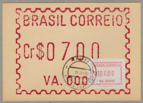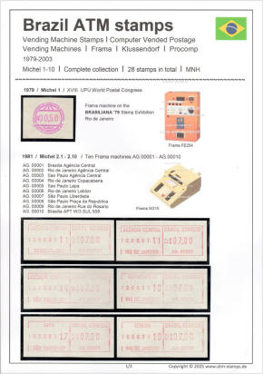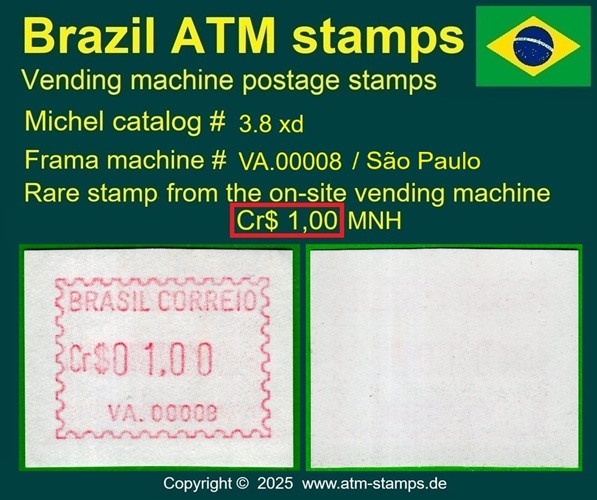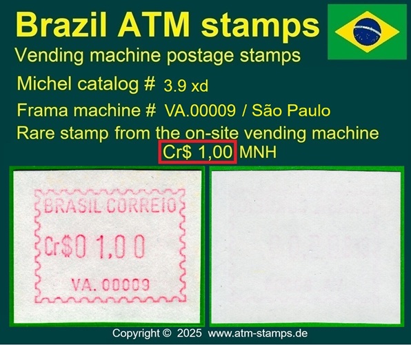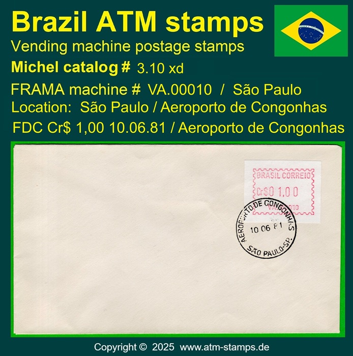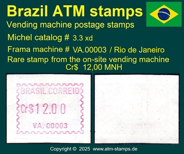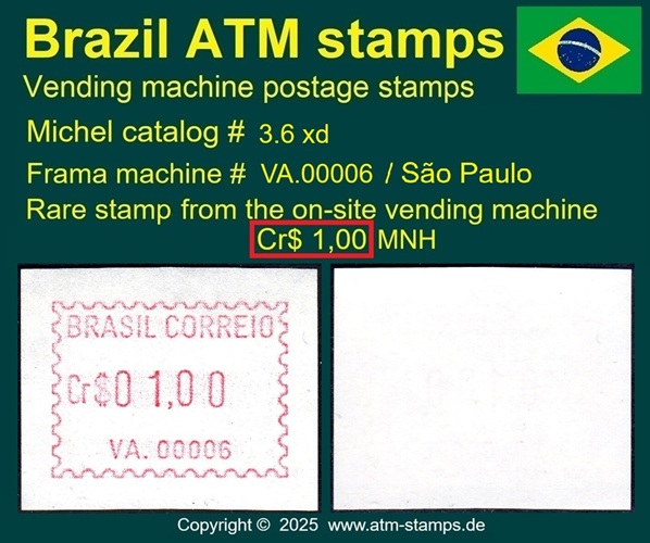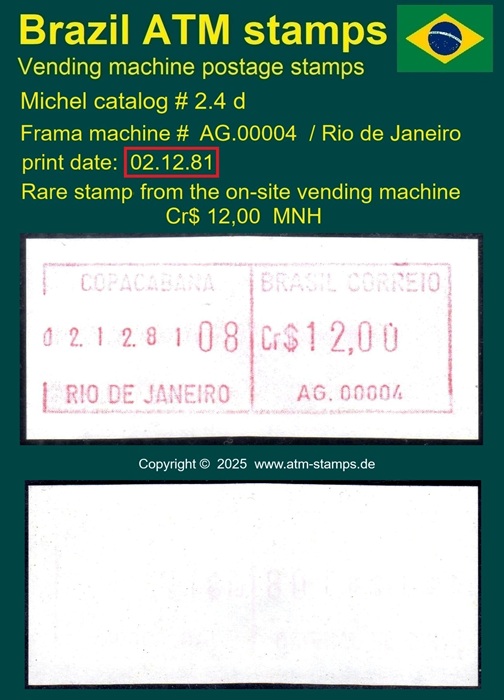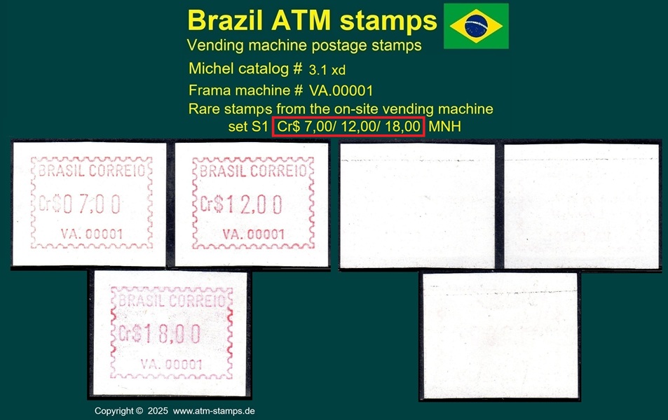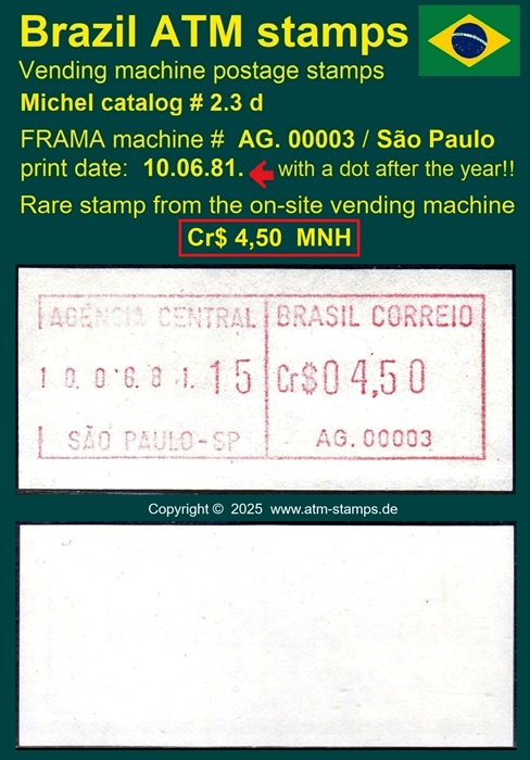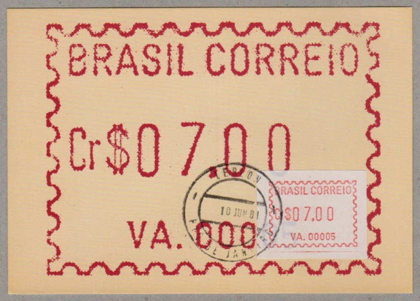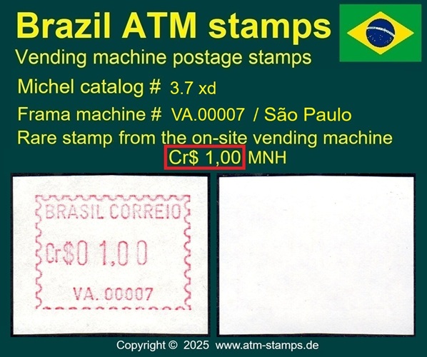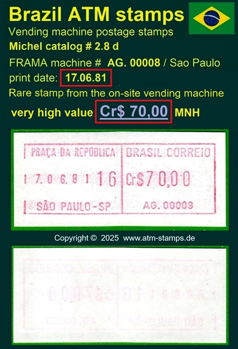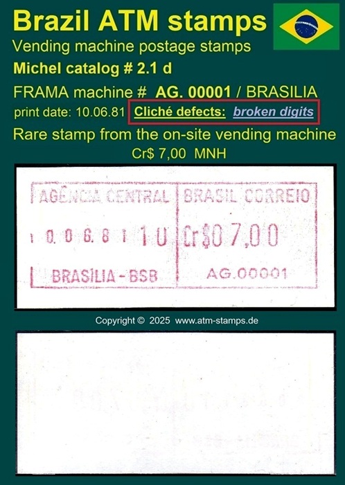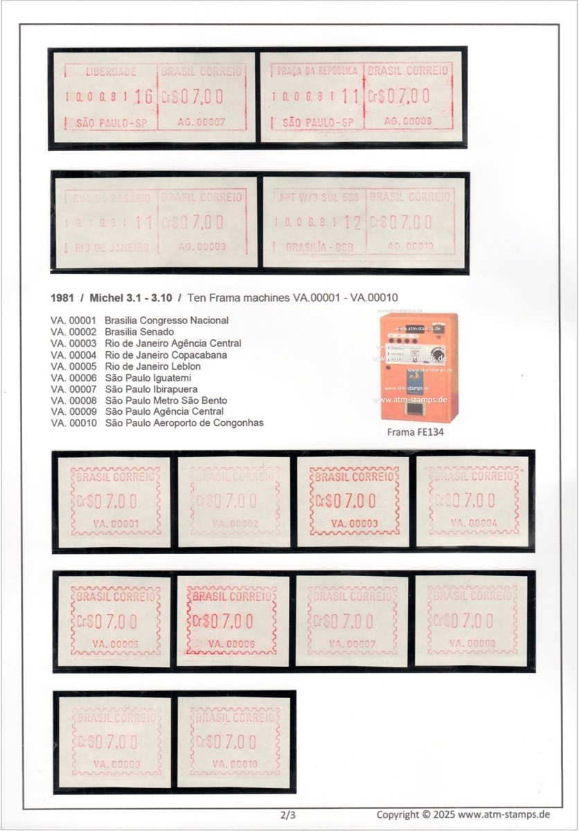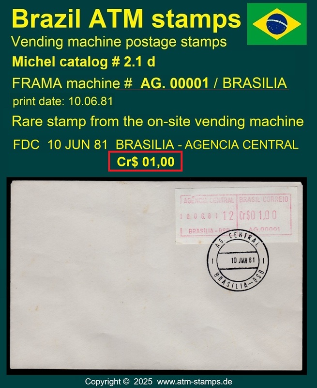 Die Postverwaltung von Brasilien nahm am 10.06.1981 insgesamt 10 Schalterwertzeichendrucker mit Automatennummern AG.00001 - AG.00010 der schweizer Firma Frama vom Typ SG15 in Brasilia, Rio de Janeira und São Paulo in Betrieb. Die Postverwaltung erklärte diese Postwertzeichen trotz aufgedrucktem Datum zu uneingeschränkt gültigen Briefmarken. Im amtlichen Erlass vom 10.6.1981 wird speziell darauf hingewiesen, dass die Marken jederzeit und überall in Brasilien verwendet werden durften und abgestempelt werden mussten. Das aufgedruckte Datum blieb unberücksichtigt. Die Marken waren dem Kunden abzugeben, damit er diese benutzen konnte, wann und wo er wollte. Die Geräte hatten grundsätzlich ein Wertespektrum von 0,01 - 99,99 (Cr$) in Stufen von 0,01 (Cr$) wobei die Postverwaltung den Mindestabgabe-Nennwert auf 7,00 (Cr$) festgelegt hatte. Bei der Versandstelle der Post waren die ATM nur in den Wertstufen 7,00 (Cr$) und 12,00 (Cr$) erhältlich, amtliche Ersttagsbelege / FDC wurden nicht angeboten. Die in den Geräten eingesetzten weißen Papierrollen (Papier rau / dunkle Fluoreszenz) wurden wahrscheinlich auch von der Firma Frama geliefert. Bei dieser Ausgabe gibt es sehr starke Farbband-Tönungen. Die dunkelrotlila Tönung ist bei ATM aus den Ortsgeräten typisch. Alle Marken mit Druckdatum 11.6.1981 – 28.12.1981 stammen von den Ortsautomaten und alle Werte außer 7,00 und 12,00 Cr$ stammen ebenfalls aus Ortsautomaten, da die Versandstelle nur die Wertstufen 7,00 und 12,00 Cr$ und immer mit dem Druckdatum 10.6.1981 (Ersttag) ausgeliefert hat. Das Porto für einen Inlandbrief betrug 7,00 Cr$ vom Ersttag 10.06.1981 – 17.07.1981, dann 12,00 Cr$ vom 18.7.1981 – 28.2.1982. Briefe mit ATM der Versandstelle sind oft nicht portogerecht frankiert. Die ATM der Versandstelle im Farbton Rotorange (in der Farbgruppe bräunlichrot) sind alle erst 1982 nach dem Versuchsende entstanden. Alle Briefe sind erst 1982 abgestempelt, teilweise nicht portogerecht frankiert, da am 1.3.1982 eine weitere Portoerhöhung in Kraft trat. Der Betriebsversuch wurde schon nach rund 6 Monaten Ende 1981 wegen der hohen Inflation, technischen Problemen und mangelnder Akzeptanz der Geräte beim Postpublikum eingestellt. Die Ausgabe wurde von den brasilianischen und europäischen Händlern seinerzeit fast ausschließlich über die Versandstelle bezogen. Diese Versandstellenmarken, die nur in den Wertstufen 7,00 Cr$ und 12,00 Cr$ und immer mit Ersttag-Druckdatum 10.6.1981 ausgeliefert wurden, machen den Großteil des verfügbaren Markenmaterials aus. Marken in anderen Wertstufen und mit späteren Druckdaten stammen grundsätzlich aus den kaum beachteten Ortsgeräten und sind sehr selten, wobei ATM und Briefe der Standorte in Brasilia und Sāo Paulo noch wesentlich seltener sind als die von Rio de Janeiro. |