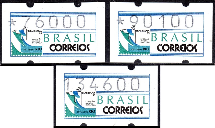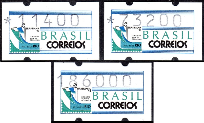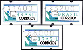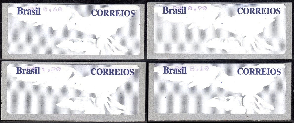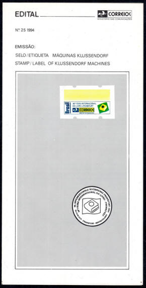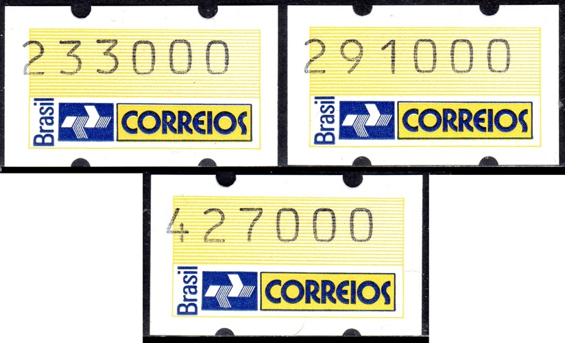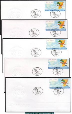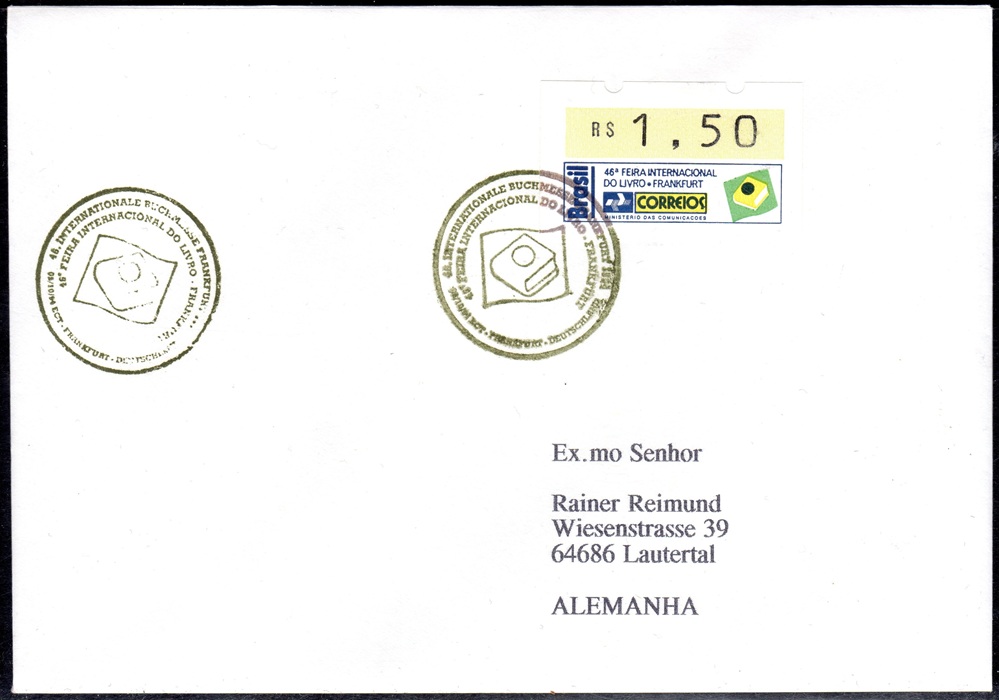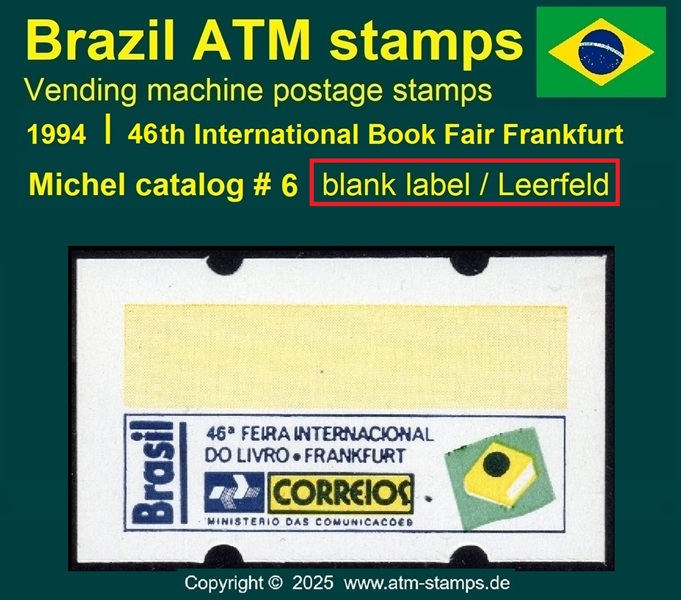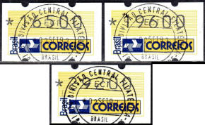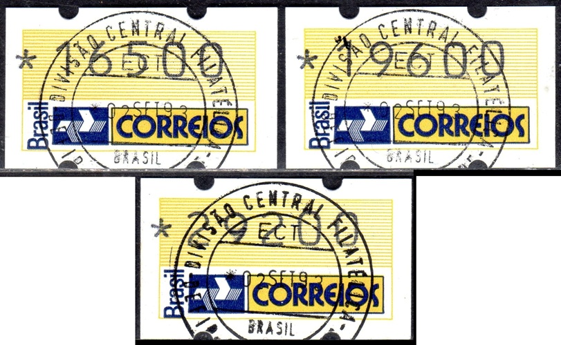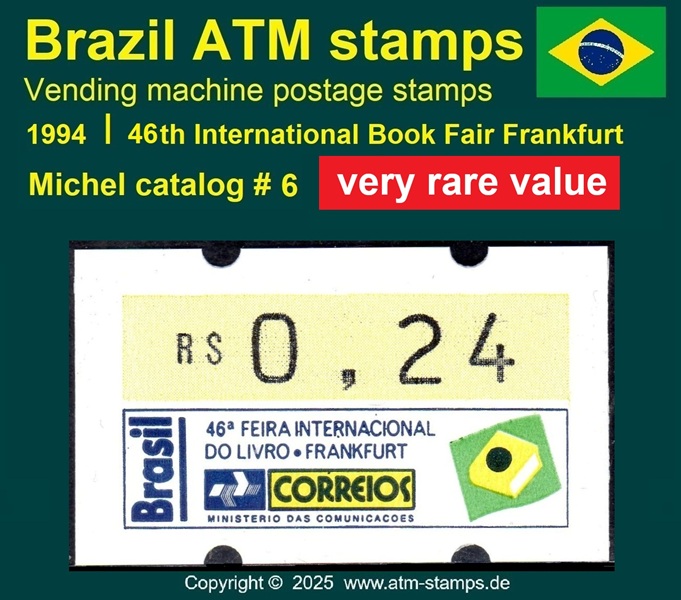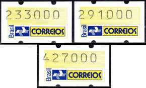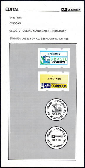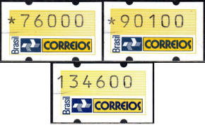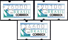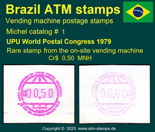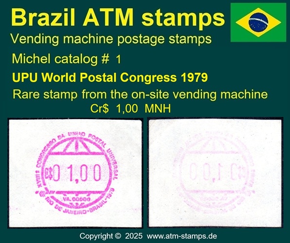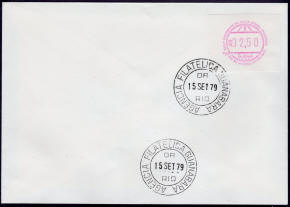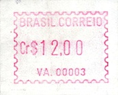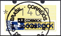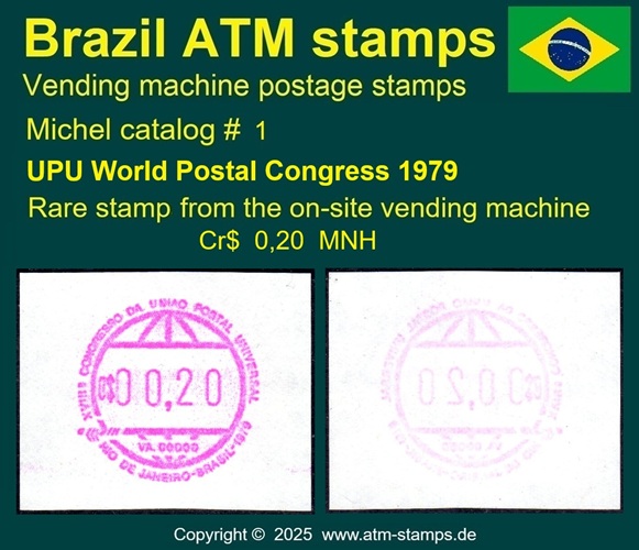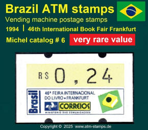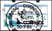 Die Postverwaltung von Brasilien nahm am 10.06.1981 insgesamt 10 Schalterwertzeichendrucker mit Automatennummern AG.00001 - AG.00010 der schweizer Firma Frama vom Typ SG15 in Brasilia, Rio de Janeira und São Paulo in Betrieb. Die Postverwaltung erklärte diese Postwertzeichen trotz aufgedrucktem Datum zu uneingeschränkt gültigen Briefmarken. Im amtlichen Erlass vom 10.6.1981 wird speziell darauf hingewiesen, dass die Marken jederzeit und überall in Brasilien verwendet werden durften und abgestempelt werden mussten. Das aufgedruckte Datum blieb unberücksichtigt. Die Marken waren dem Kunden abzugeben, damit er diese benutzen konnte, wann und wo er wollte. Die Geräte hatten grundsätzlich ein Wertespektrum von 0,01 - 99,99 (Cr$) in Stufen von 0,01 (Cr$) wobei die Postverwaltung den Mindestabgabe-Nennwert auf 7,00 (Cr$) festgelegt hatte. Bei der Versandstelle der Post waren die ATM nur in den Wertstufen 7,00 (Cr$) und 12,00 (Cr$) erhältlich, amtliche Ersttagsbelege / FDC wurden nicht angeboten. Die in den Geräten eingesetzten weißen Papierrollen (Papier rau / dunkle Fluoreszenz) wurden wahrscheinlich auch von der Firma Frama geliefert. Bei dieser Ausgabe gibt es sehr starke Farbband-Tönungen. Die dunkelrotlila Tönung ist bei ATM aus den Ortsgeräten typisch. Alle Marken mit Druckdatum 11.6.1981 – 28.12.1981 stammen von den Ortsautomaten und alle Werte außer 7,00 und 12,00 Cr$ stammen ebenfalls aus Ortsautomaten, da die Versandstelle nur die Wertstufen 7,00 und 12,00 Cr$ und immer mit dem Druckdatum 10.6.1981 (Ersttag) ausgeliefert hat. Das Porto für einen Inlandbrief betrug 7,00 Cr$ vom Ersttag 10.06.1981 – 17.07.1981, dann 12,00 Cr$ vom 18.7.1981 – 28.2.1982. Briefe mit ATM der Versandstelle sind oft nicht portogerecht frankiert. Die ATM der Versandstelle im Farbton Rotorange (in der Farbgruppe bräunlichrot) sind alle erst 1982 nach dem Versuchsende entstanden. Alle Briefe sind erst 1982 abgestempelt, teilweise nicht portogerecht frankiert, da am 1.3.1982 eine weitere Portoerhöhung in Kraft trat. Der Betriebsversuch wurde schon nach rund 6 Monaten Ende 1981 wegen der hohen Inflation, technischen Problemen und mangelnder Akzeptanz der Geräte beim Postpublikum eingestellt. Die Ausgabe wurde von den brasilianischen und europäischen Händlern seinerzeit fast ausschließlich über die Versandstelle bezogen. Diese Versandstellenmarken, die nur in den Wertstufen 7,00 Cr$ und 12,00 Cr$ und immer mit Ersttag-Druckdatum 10.6.1981 ausgeliefert wurden, machen den Großteil des verfügbaren Markenmaterials aus. Marken in anderen Wertstufen und mit späteren Druckdaten stammen grundsätzlich aus den kaum beachteten Ortsgeräten und sind sehr selten, wobei ATM und Briefe der Standorte in Brasilia und Sāo Paulo noch wesentlich seltener sind als die von Rio de Janeiro. |