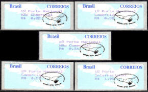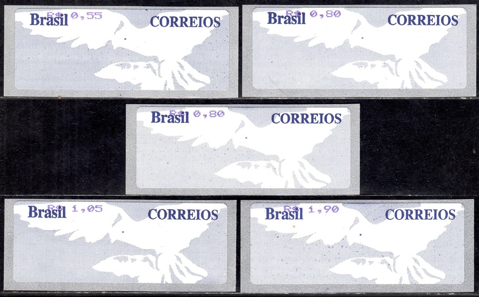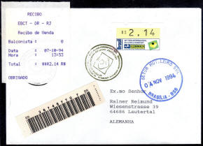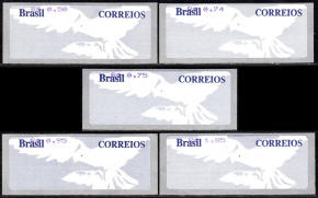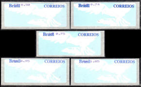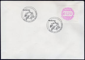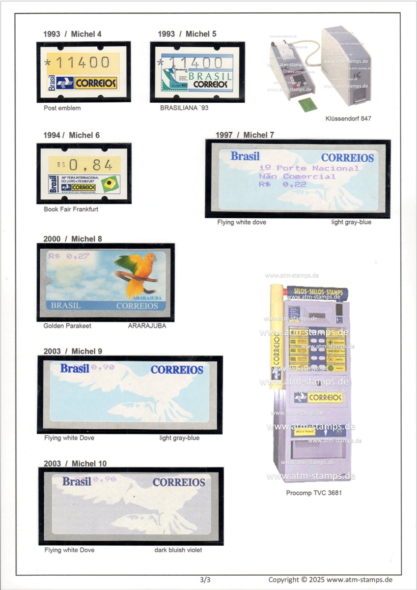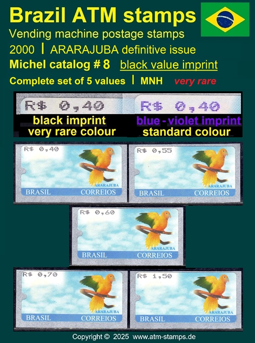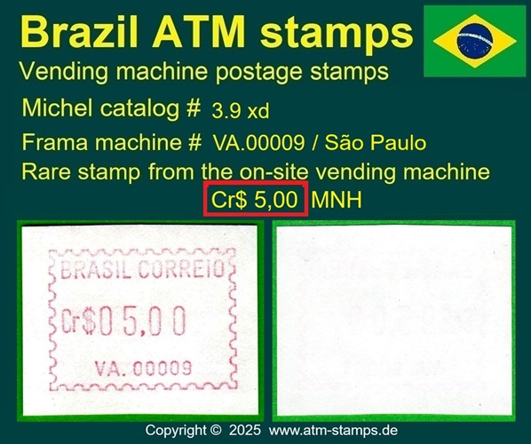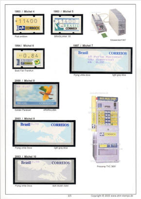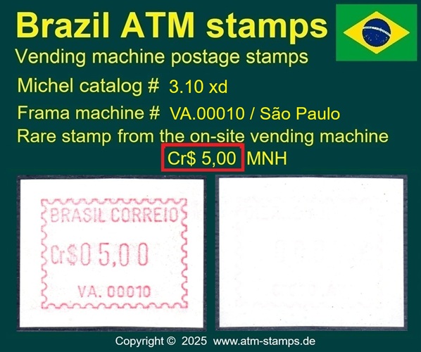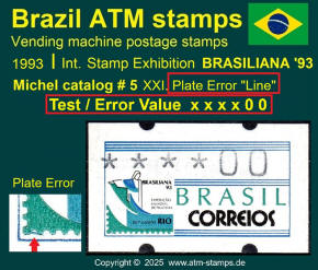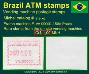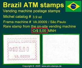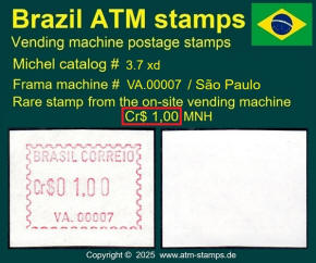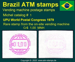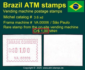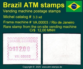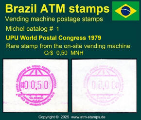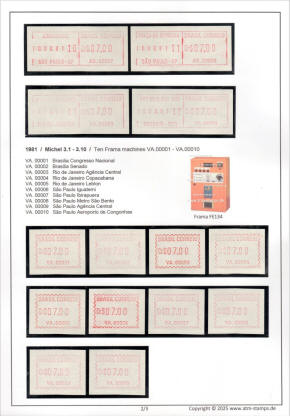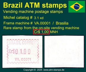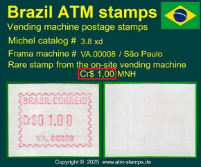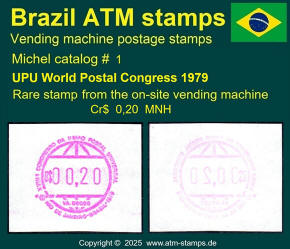 Die Postverwaltung von Brasilien nahm am 10.06.1981 neben den 10 Schalterwertzeichendrucker SG15 (Michel 2) auch 10 Münzwertzeichendrucker der Firma Frama Typ FE145 mit Automatennummern VA.00001 - VA.00010 in Brasilia, Rio de Janeira und São Paulo in Betrieb. Die Münzwertzeichendrucker hatten ein Wertespektrum von 1,00 - 99,00 (Cr$) in Stufen von 1,00 (Cr$) und waren mit einem Tastensatz von 3 Wertstufen 7,00, 12,00, 18,00 (Cr$) programmiert, der auch nach der Portoerhöhung vom 17.07.1981 nicht geändert wurde. Die Geräte akzeptierten Münzen im Nennwert von 1,00, 5,00 und 10,00 Cr$. zu viel bezahlter Betrag wurde von den Geräten als ATM anstatt als Münzen erstattet. Bei der Versandstelle waren die ATM nur in den Wertstufen 1,00 (Cr$), 7,00 (Cr$) und 12,00 (Cr$) erhältlich, es wurden aber keine amtlichen Ersttagsbelege / FDC angeboten. Die eingesetzten weißen Papierrollen (Papier rau / dunkle Fluoreszenz und rau / helle Fluoreszenz) wurden wahrscheinlich von der Firma Frama geliefert. Bei dieser Ausgabe gibt es sehr starke Farbband-Tönungen. Die dunkelrotlila Tönung ist bei ATM aus den Ortsgeräten typisch. Alle Werte außer 7,00 und 12,00 Cr$ stammen ebenfalls aus Ortsautomaten, da die Versandstelle nur diese Wertstufen ausgeliefert hat. Für den Printer der Versandstelle wurden nur bräunlichrote Farbbänder verwendet. Das Porto für einen Inlandbrief betrug 7,00 Cr$ vom Ersttag 10.6.1981 – 17.7.1981, dann 12,00 Cr$ vom 18.7.1981 – 28.2.1982. Briefe mit ATM der Versandstelle sind oft nicht portogerecht frankiert. Die ATM der Versandstelle im Farbton Rotorange (in der Farbgruppe bräunlichrot) sind alle erst 1982 nach dem Versuchsende entstanden. Alle Briefe sind erst 1982 abgestempelt, teilweise nicht portogerecht frankiert, da am 1.3.1982 eine weitere Portoerhöhung in Kraft trat. Der Betriebsversuch wurde schon nach rund 6 Monaten Ende 1981 wegen der hohen Inflation, technischen Problemen und mangelnder Akzeptanz der Geräte beim Postpublikum eingestellt. Die Ausgabe wurde von den brasilianischen und europäischen Händlern seinerzeit fast ausschließlich über die Versandstelle bezogen. Diese Versandstellenmarken, die nur in den Wertstufen 7,00 Cr$, 12,00 Cr$ und in wenigen Fällen wohl auch 1,00 Cr$ ausgeliefert wurden, machen den Großteil des verfügbaren Markenmaterials aus. Marken in anderen Wertstufen stammen grundsätzlich aus den kaum beachteten Ortsgeräten und sind sehr selten, wobei ATM und Briefe der Standorte in Brasilia und Sāo Paulo noch wesentlich seltener sind als die von Rio de Janeiro. |