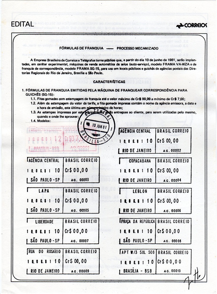 2.1 | AG. 00001 | Brasilia Hauptpostamt Agência Central | 10.06.1981 | 28.12.1981 | 2.6 | AG. 00006 | Rio de Janeiro Postamt Leblon | 10.06.1981 | 28.12.1981 | ||