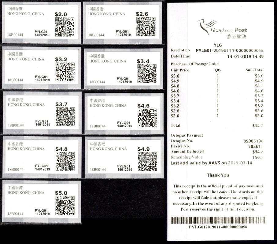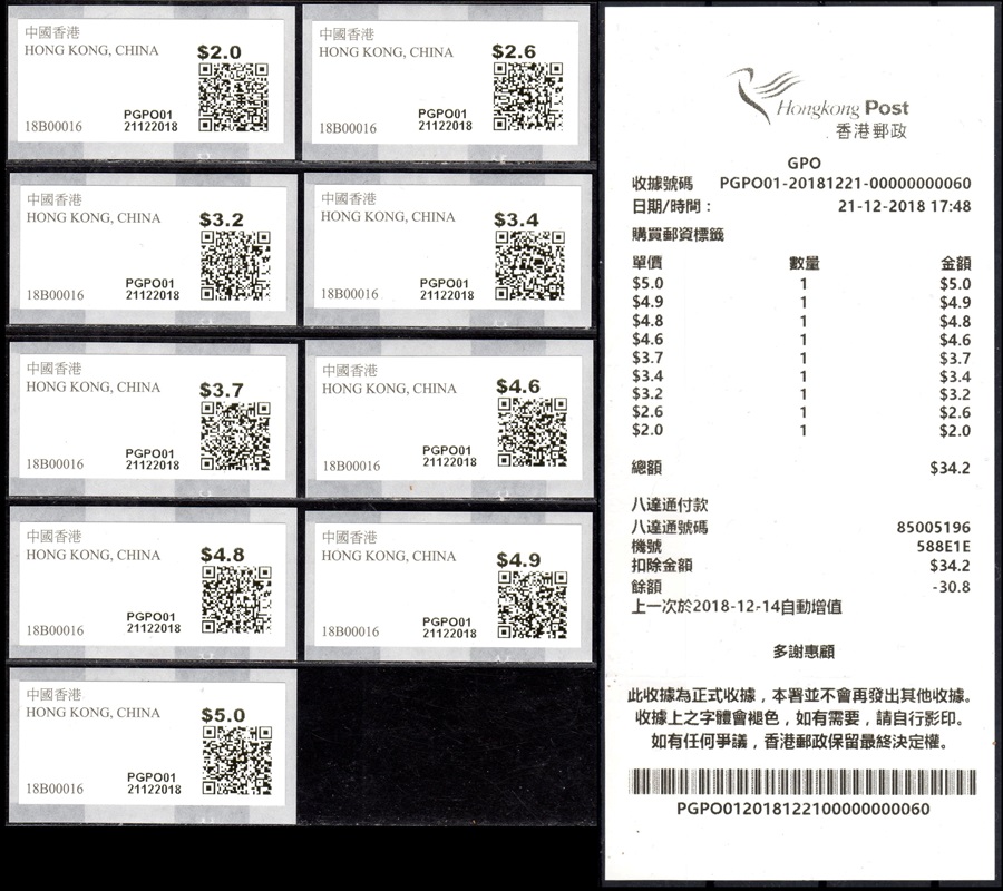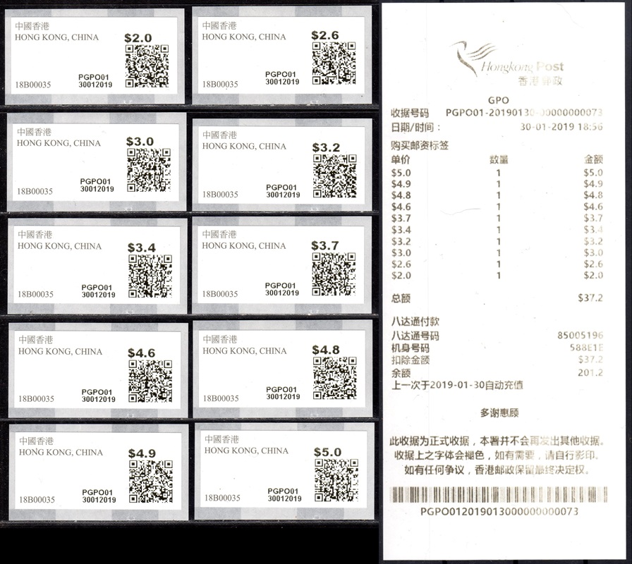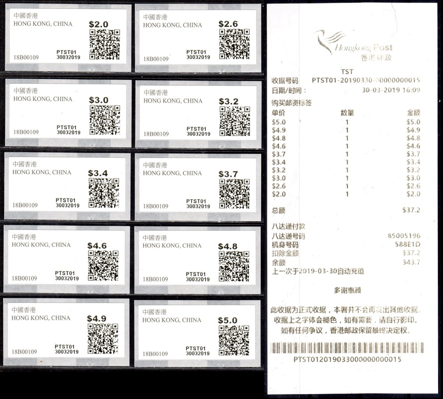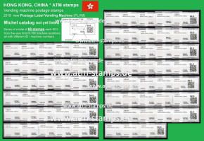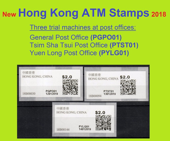 Am 17.12.18 wurde beim Postamt Hongkong Tsim Sha Tsui (TST) der erste von drei neuen PLVM Versuchsautomaten in Betrieb genommen (PLVM = Postage Label Vending Machine). Zwei weitere Geräte folgten am 18.12.18 beim Hauptpostamt (GPO = General Post Office) und am 19.12.18 beim Postamt Yuen Long (YLG). Die Geräte hängen an den Außenwänden der Postämter neben den Briefkästen. Bezahlung ist nur mit der Octopus-Karte möglich, die in Hongkong weit verbreitet ist und an Automaten und Geschäften gegen Barzahlung gekauft und aufgeladen werden kann. Neben neun Tastenwerten 2.0, 2.6, 3.2, 3.4, 3.7, 4.6, 4.8, 4.9, 5.0 $ sind nach Eingabe des Bestimmungslandes, des Formats und des Gewichts auch ATM mit weiteren Portowerten erhältlich. Vorgedruckt sind die Landesbezeichnung „HONG KONG, CHINA“, das Hongkong Post Logo (unter UV-Licht erkennbar) sowie die Rollennummer (z. B. 18B00032 für die 32. Vordruckrolle), vom Gerät wird die Wertangabe, die Automatennummer (PTST01, PGPO01 bzw. PYLG01), das Datum und ein QR-Code aufgedruckt. Auslesen des QR-Codes liefert unter anderem die Nummer der ATM (z. B. PLVM, 18B000320321 für die 321 ATM der 32. Rolle). Auf Wunsch sind eine Quittung und ein Dublikat der Quittung erhältlich. Die ATM müssen gestempelt werden und können zusammen mit Briefmarken und Schalterfreistempeln benutzt werden. Auf dem Trägerpapier steht ein Hinweis, dass die ATM baldmöglichst verwendet werden sollen, da verblasste ATM ungültig sind und nicht erstattet werden. Ende Januar 2019, also nach nur ca. einem Monat wurde der Tastensatz um die Wertstufe 3.0$ erweitert und enthält jetzt 10 Wertstufen 2.0, 2.6, 3.0, 3.2, 3.4, 3.7, 4.6, 4.8, 4.9, 5.0 $. Im Oktober 2019 kündigte die Post einen weiteren PLVM Automaten an, der am Kowloon Bay Post Office den bestehenden "Electronic Stamp Vending Machine" ersetzen soll. Der Ersttag dieses Automaten war am 31.10.2019 mit der Automaten-Nr. PKBY01. Ab November 2019 hat die Hong Kong Post dann mit genauen Zeitplänen und Standorten die Einführung von monatlich ca. 30 dieser Automaten bis Juni 2020 angekündigt. Im Sommer 2021 kündigte die Hong Kong Post die Einführung von iPostal Kiosken an: Um das Kundenerlebnis zu verbessern, wird Hongkong Post iPostal-Kioske einführen, um automatisierte Versanddienste, den Kauf von Versandetiketten und Portoanfragen anzubieten. Die ersten drei iPostal-Kioske werden an den folgenden Standorten aufgestellt: General Post Office, Bellagio Mall, Tung Chung Post Office. Ersttag der drei Kioske: 19.07.2021 Diese neue Initiative gilt für lokale und