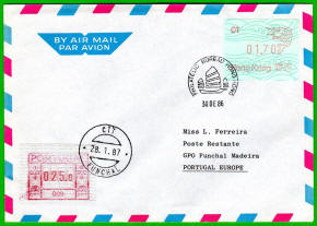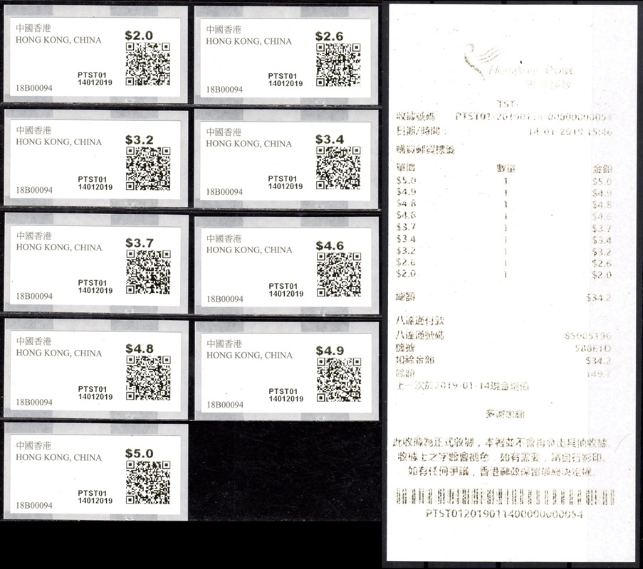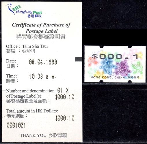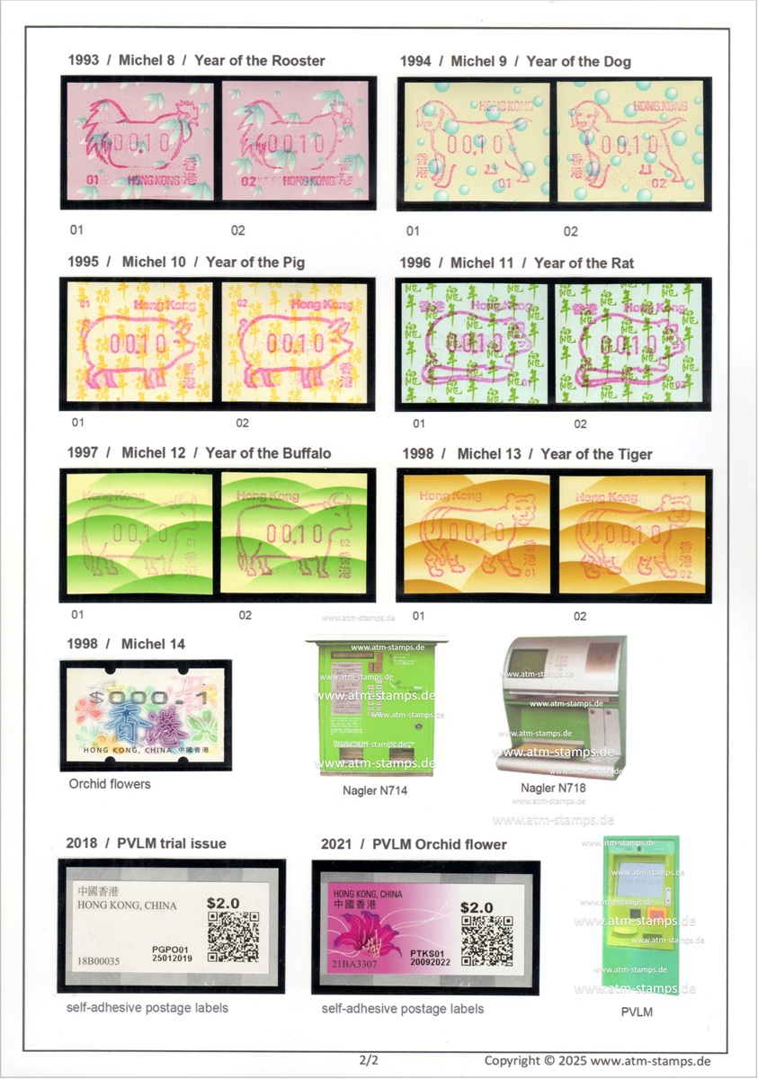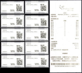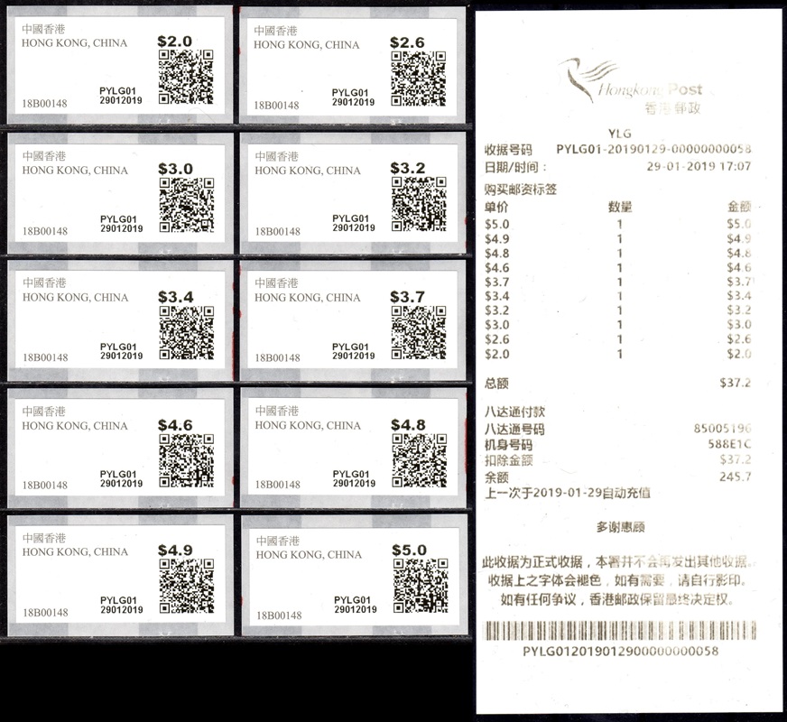 Am 17.12.18 wurde beim Postamt Hongkong Tsim Sha Tsui (TST) der erste von drei neuen PLVM Versuchsautomaten in Betrieb genommen (PLVM = Postage Label Vending Machine). Zwei weitere Geräte folgten am 18.12.18 beim Hauptpostamt (GPO = General Post Office) und am 19.12.18 beim Postamt Yuen Long (YLG). Die Geräte hängen an den Außenwänden der Postämter neben den Briefkästen. Bezahlung ist nur mit der Octopus-Karte möglich, die in Hongkong weit verbreitet ist und an Automaten und Geschäften gegen Barzahlung gekauft und aufgeladen werden kann. Neben neun Tastenwerten 2.0, 2.6, 3.2, 3.4, 3.7, 4.6, 4.8, 4.9, 5.0 $ sind nach Eingabe des Bestimmungslandes, des Formats und des Gewichts auch ATM mit weiteren Portowerten erhältlich. Vorgedruckt sind die Landesbezeichnung „HONG KONG, CHINA“, das Hongkong Post Logo (unter UV-Licht erkennbar) sowie die Rollennummer (z. B. 18B00032 für die 32. Vordruckrolle), vom Gerät wird die Wertangabe, die Automatennummer (PTST01, PGPO01 bzw. PYLG01), das Datum und ein QR-Code aufgedruckt. Auslesen des QR-Codes liefert unter anderem die Nummer der ATM (z. B. PLVM, 18B000320321 für die 321 ATM der 32. Rolle). Auf Wunsch sind eine Quittung und ein Dublikat der Quittung erhältlich. Die ATM müssen gestempelt werden und können zusammen mit Briefmarken und Schalterfreistempeln benutzt werden. Auf dem Trägerpapier steht ein Hinweis, dass die ATM baldmöglichst verwendet werden sollen, da verblasste ATM ungültig sind und nicht erstattet werden. Ende Januar 2019, also nach nur ca. einem Monat wurde der Tastensatz um die Wertstufe 3.0$ erweitert und enthält jetzt 10 Wertstufen 2.0, 2.6, 3.0, 3.2, 3.4, 3.7, 4.6, 4.8, 4.9, 5.0 $. Im Oktober 2019 kündigte die Post einen weiteren PLVM Automaten an, der am Kowloon Bay Post Office den bestehenden "Electronic Stamp Vending Machine" ersetzen soll. Der Ersttag dieses Automaten war am 31.10.2019 mit der Automaten-Nr. PKBY01. Ab November 2019 hat die Hong Kong Post dann mit genauen Zeitplänen und Standorten die Einführung von monatlich ca. 30 dieser Automaten bis Juni 2020 angekündigt. Im Sommer 2021 kündigte die Hong Kong Post die Einführung von iPostal Kiosken an: Um das Kundenerlebnis zu verbessern, wird Hongkong Post iPostal-Kioske einführen, um automatisierte Versanddienste, den Kauf von Versandetiketten und Portoanfragen anzubieten. Die ersten drei iPostal-Kioske werden an den folgenden Standorten aufgestellt: General Post Office, Bellagio Mall, Tung Chung Post Office. Ersttag der drei Kioske: 19.07.2021 Diese neue Initiative gilt für lokale und