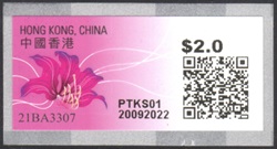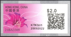 Am 23.12.21 erschien die ATM mit Abbildung der als Stadtblume Hongkongs bekannten Bauhinia x blakeana. Neben den 10 Tastenwerten 2.0, 2.6, 3.0, 3.2, 3.4, 3.7, 4.6, 4.8, 4.9, 5.0 $ sind nach Eingabe des Bestimmungslandes, des Formats und des Gewichts auch ATM mit weiteren Portowerten erhältlich. Vorgedruckt sind die Landesbezeichnung „HONG KONG, CHINA“, das Hongkong Post Logo (unter UV-Licht erkennbar) sowie die Rollennummer, vom Gerät wird die Wertangabe, die Automatennummer, das Datum und ein QR-Code aufgedruckt. Die ATM müssen gestempelt werden und können zusammen mit Briefmarken und Schalterfreistempeln benutzt werden. Die ATM aus PLVM-Geräten haben einen fetten Wertaufdruck und die Automatennummern beginnen mit einem "P", die aus iPostal Kiosken haben einen normalen Wertaufdruck und die Automatennummern beginnen mit einem "K". |