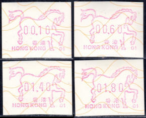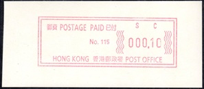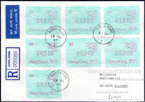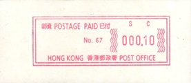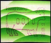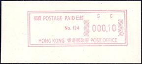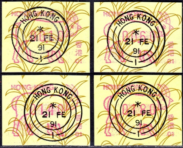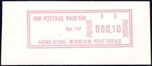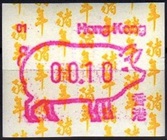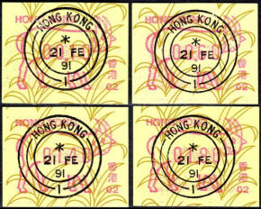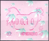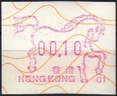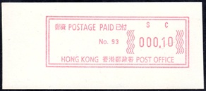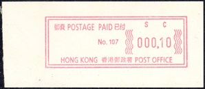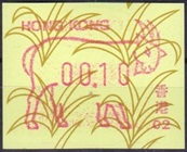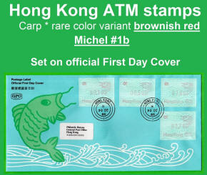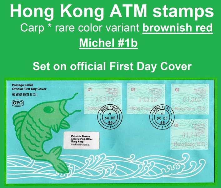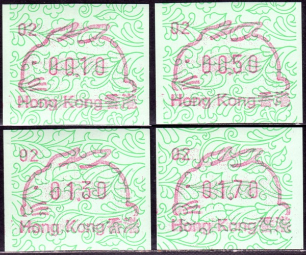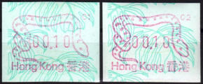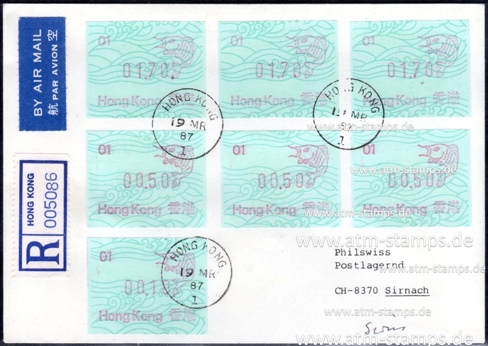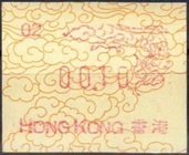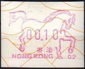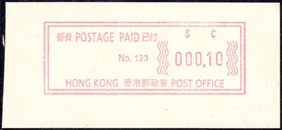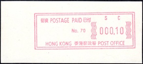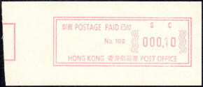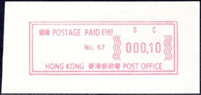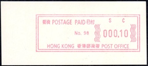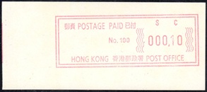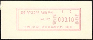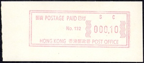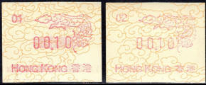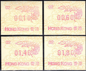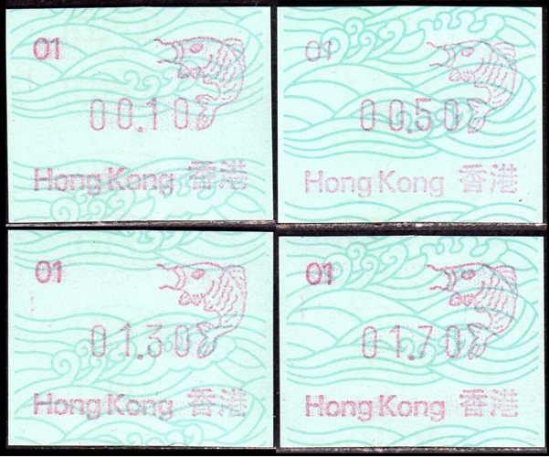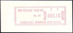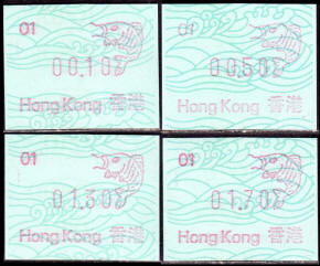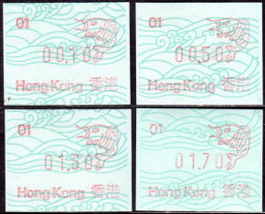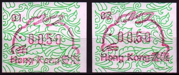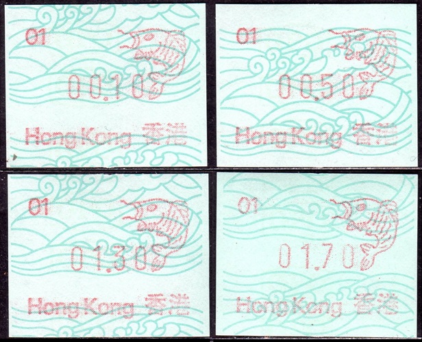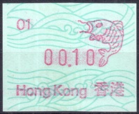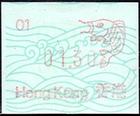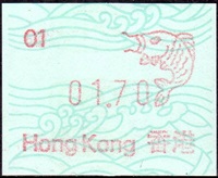 Die Postverwaltung von Hongkong gab 1986, noch als britische Kronkolonie, die erste Automatenmarke heraus. Das Markenmotiv zeigt einen Karpfen auf farbigen Markenpapier mit stilisierten Wellen. Das Vordruckpapier hat einen fluoreszierenden Sicherheitsaufdruck GPO Hong Kong und wurde im Offsetdruck von Leigh-Mardon, Australien hergestellt. Der einzige Ortsautomat des schweizer Herstellers Frama vom Typ FE264 war in der Hauptpost (GPO) installiert und hatte vier programmierte Tastenwertstufen 0.10, 0,50, 1.30, 1.70 ($) andere Wertstufen waren nicht möglich. Die Ausgabe war auch bei der Versandstelle erhältlich und amtliche FDC mit den vier Wertstufen wurde angeboten. Die Versandstelle verwendete Farbänder in der Farbe graulila (c) und im Standortautomaten wurden Farbbänder in der Farbe bräunlichrot (b) verwendet. |