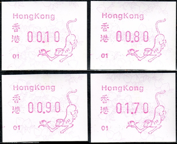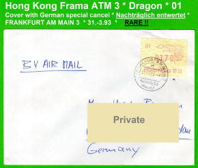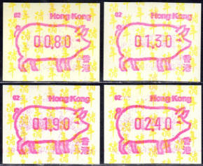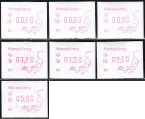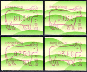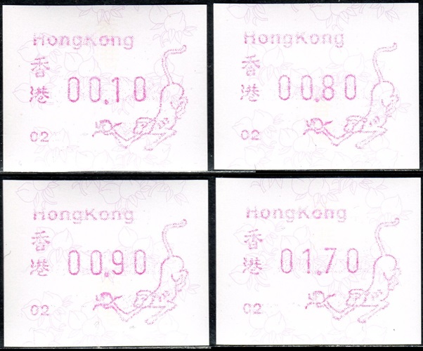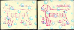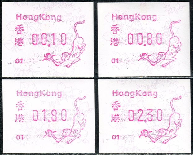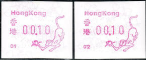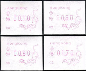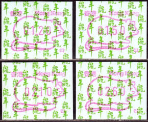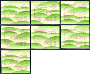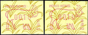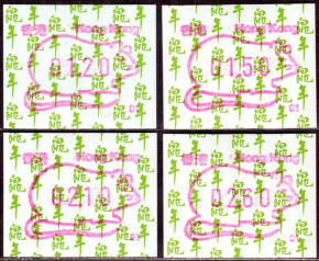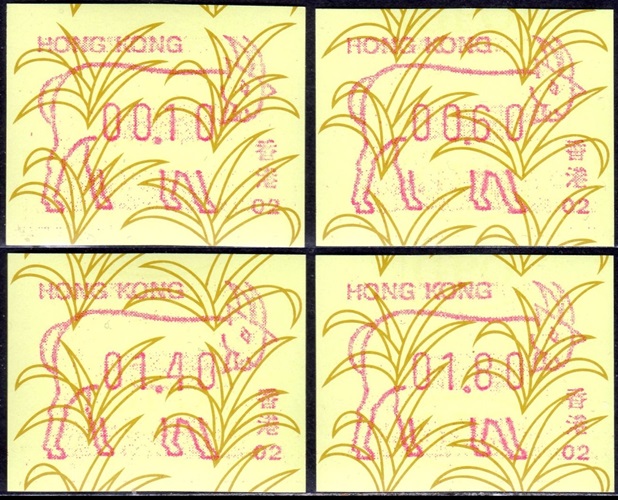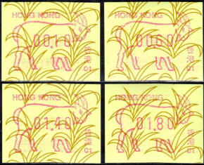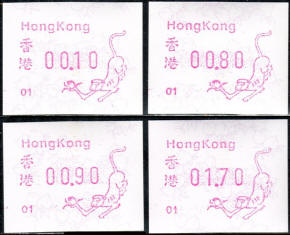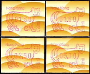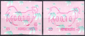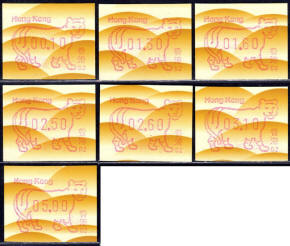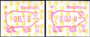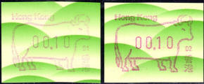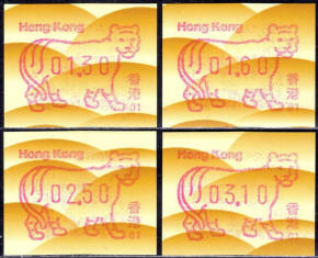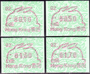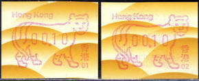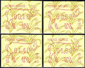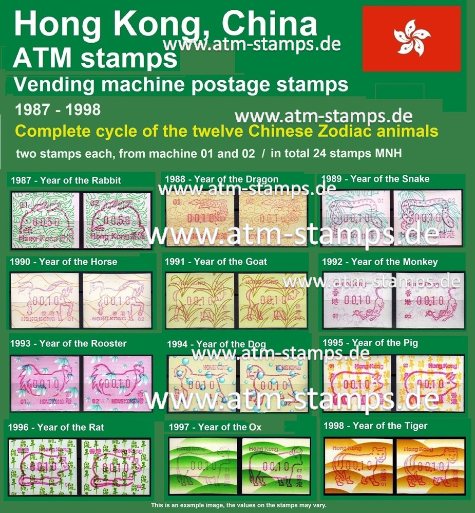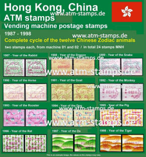 Am 18.08.1987 begann die Post die Herausgabe von ATM mit Motiven des 12-jährigen Zyklus der Tierkreiszeichen des chinesischen Mondkalenders mit dem Markenmotiv zum Jahr des Hasen. Das Vordruckpapier hat einen fluoreszierenden Sicherheitsaufdruck GPO Hong Kong und wurde im Offsetdruck von Leigh-Mardon, Australien hergestellt. Diese Ausgabe, sowie alle folgenden Ausgaben mit den Motiven der verschiedenen Tierkreiszeichen waren aus zwei Frama Ortsautomaten vom Typ FE264 erhältlich. Der eine Standort mit der Automatennummer 01 war bei der Hauptpost und der zweite mit der Automatennummer 02 beim Postamt Tsim Sha Tsui (Kowloon). Alle Ausgaben waren auch bei der Versandstelle erhältlich, amtliche FDC wurden aber nur von der Michel 1 (Karpfen) angeboten. Ab der Ausgabe zum Jahr der Ziege in 1991 wurden die beiden Automaten vom Typ FE264 durch zwei neue Automaten vom Typ FE1610 ersetzt. Diese Automaten hatten eine 12er-Tastatur mit der alle Wertstufen zwischen 0.10 bis 5.00 ($) in Stufen von 0.10 ($) ausgewählt werden konnten. In der Laufzeit zum Jahr des Ochsen am 1.7.1997 wurde die ehemalige britische Kronkolonie Hongkong in die Volksrepublik China als Sonderverwaltungszone eingegliedert. Für die ATM-Ausgabe hatte dies aber keine Auswirkungen, die beiden Automaten liefen normal weiter und auch die letzte Ausgabe, und somit der Abschluß des 12 jährigen Zyklus der Tierkreiszeichen zum Jahr des Tigers wurde am 11.02.1998 noch herausgegeben. Nach einer kurzen Laufzeit der Tiger Ausgabe endete dann am 28.03.1998 auch die Ära der Frama Automaten in Hongkong. |
