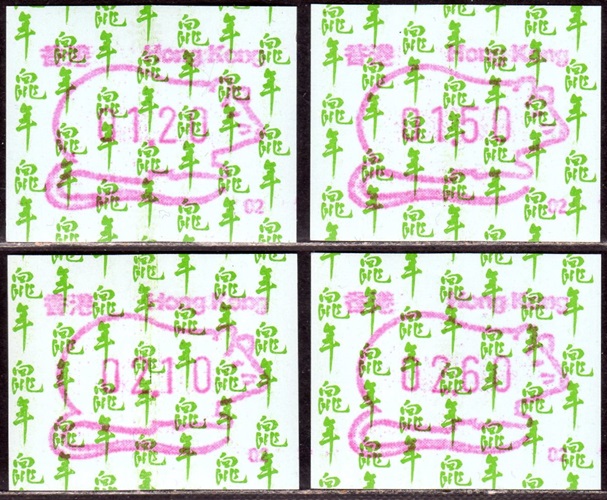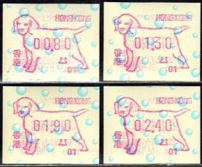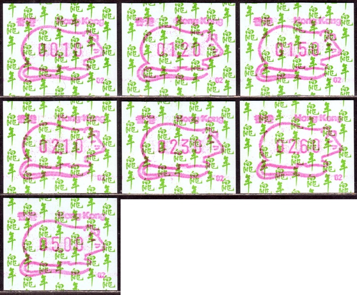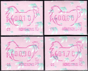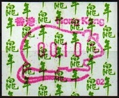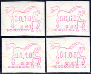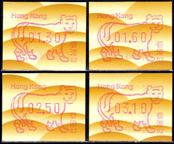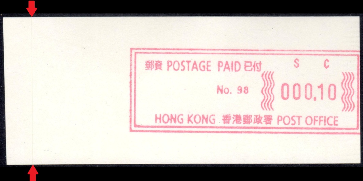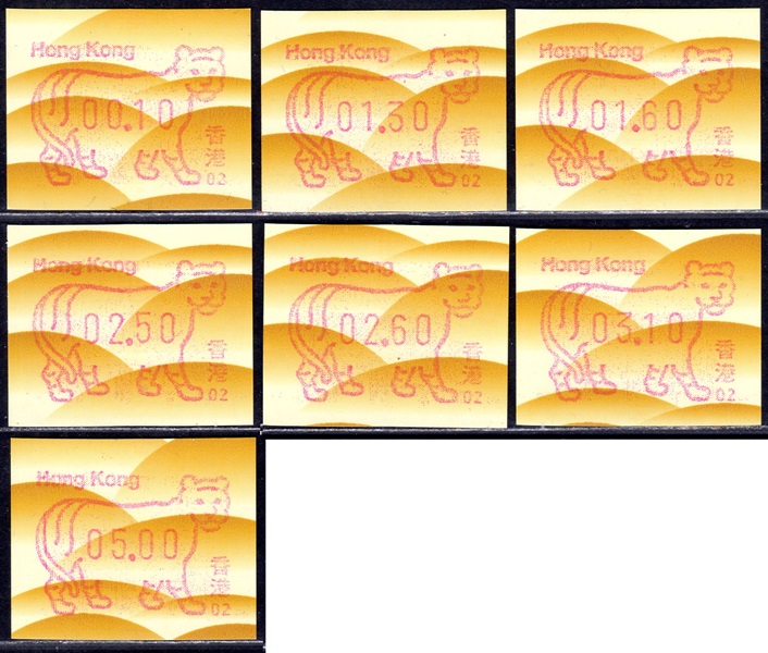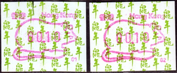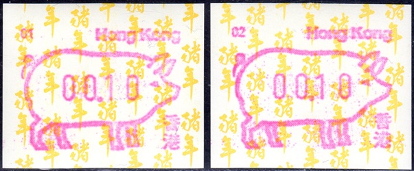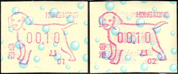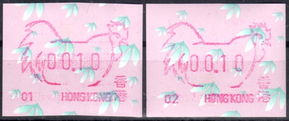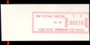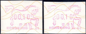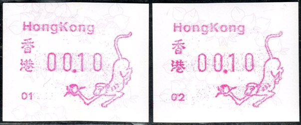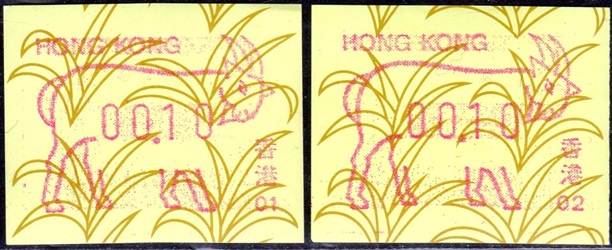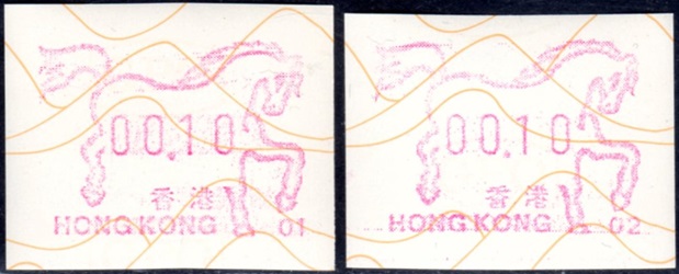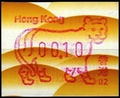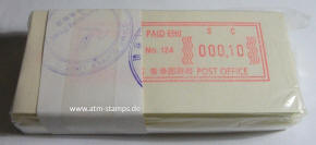 Die Postverwaltung von Hongkong erhöhte am 1. April 2002 die Portogebühren. Der lokale Brieftarif wurde von 1,30 HK$ auf 1,40 HK$ angehoben. Dies führte zu einem enormen Anstieg der Nachfrage nach Briefmarken im Wert von 0,10 HK$ pro Tag von 20.000 auf 200.000 Stück, was durch vorhandene 0,10 HK$ Briefmarken nicht ausgeglichen werde konnte. Um dieses Problem kurzfristig zu lösen, entschied die Postverwaltung 0,10 HK$ Automatenmarken aus 30 Schalterfreistempelgeräten der Firma Hasler vom Typ Mailmaster mit Automatennummern (65, 67, 69, 70, 72, 75, 78, 80, 89, 92, 93, 95, 98, 100, 102, 104, 107, 115, 116, 117, 119, 120, 124, 127, 129, 131, 132, 133, 137 und 138) aber ohne Datum herzustellen und dem Postkunden ab dem 10. April zur Verfügung zustellen. Ab dem 26. Juni gab es diese Automatenmarken nur noch in vier Postämtern bis sie dann kurz darauf ganz aus dem Angebot verschwanden. Diese speziellen Automatenmarken, auch "Notfallmarken" genannt, waren in Hongkong überall und jederzeit frankaturgültig und entsprechen somit ATM. Auch die Versandstelle der Post lieferte diese Automatenmarken, allerdings wohl nicht alle 30 Gerätenummern. Das Markenpapier ist weiß bzw. cremeweiß und ist selbstklebend auf einem Trägerpapier. Die Abmessungen sind ca. 43mm in der Höhe wobei die Breite zwischen ca. 88 bis 110mm schwanken kann. Selten sind Marken mit einer "Abziehhilfe" bei denen das Markenpapier ca. 10mm vom linken Rand über die gesamte Markenhöhe einen Einstich bzw. eine Stanzung hat, um die Marken besser vom Trägerpapier abziehen zu können. Selten sind außerdem Marken bei denen am linken Markenrand noch Reste von einem Rahmen für eine Registriernummer gedruckt ist. |