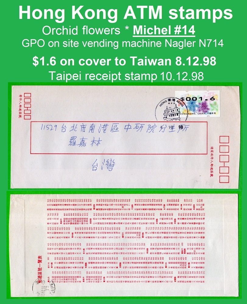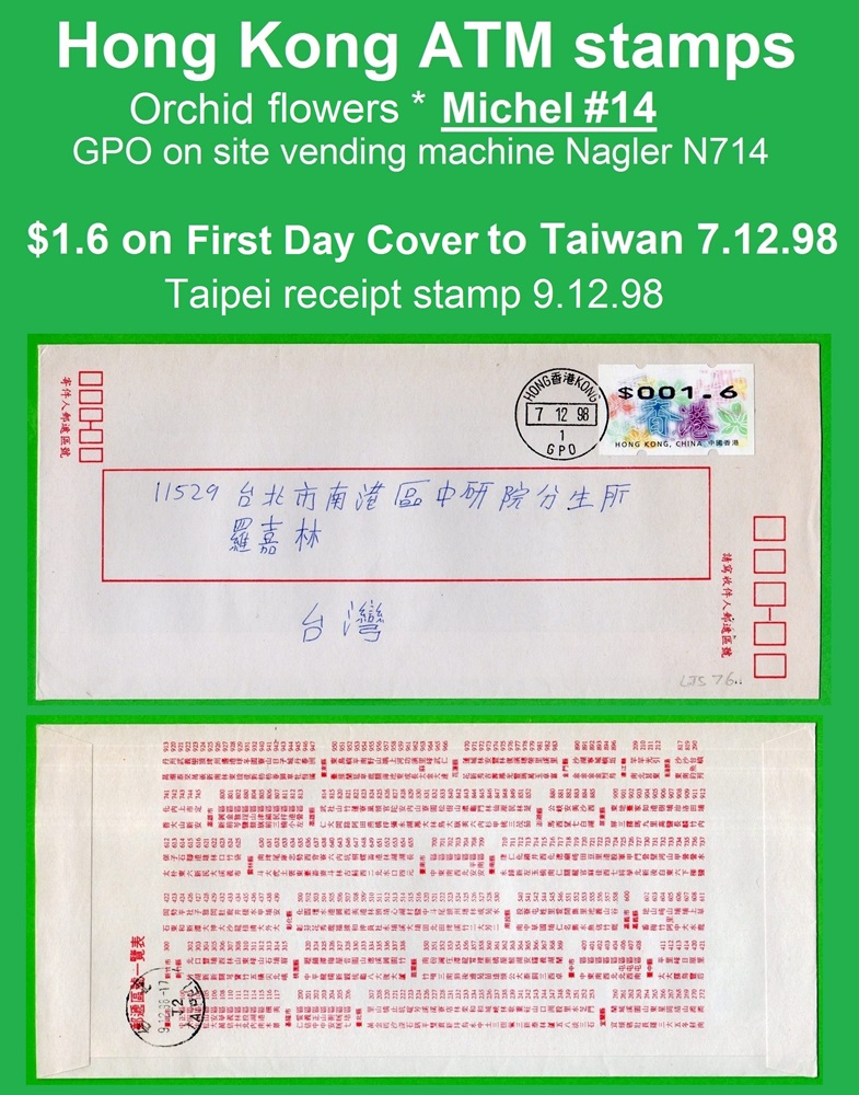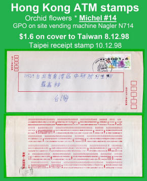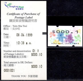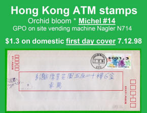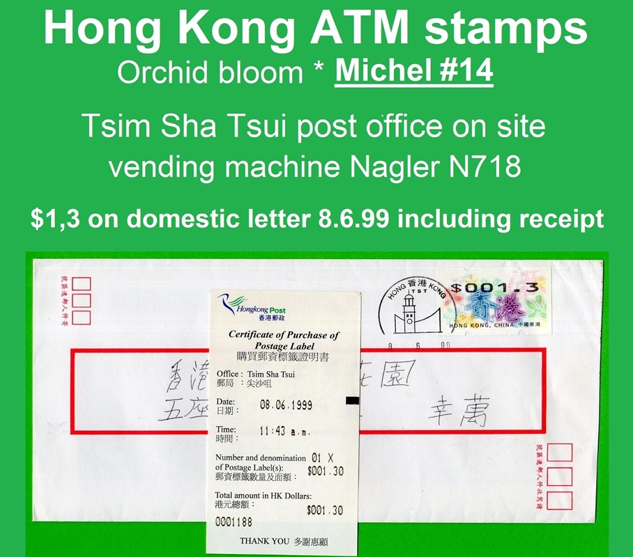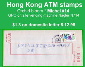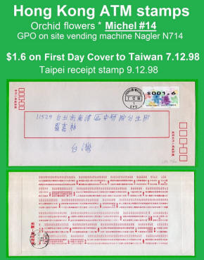 Am 7.12.1998 erschien die mehrfarbige und graphisch sehr ansprechende ATM aus zwei Nagler Geräten N714 am Standort Hauptpost (GPO) und Postamt Tsim Sha Tsui (Kowloon). Es ist die erste ATM-Ausgabe mit der neuen Landesbezeichnung Hong Kong, China. Die Geräte waren mit acht Tastenwertstufen programmierte 0.1, 0.5, 1.2, 1.3, 1.6, 2.1, 2.5, 3.1 ($) und Werte bis 270.0 ($) in Stufen von 0.1 ($) waren möglich. Ein halbes Jahr später, am 07.06.1999 wurde ein weiteres Gerät der Firma Nagler, diesmal das Modell N718 im Postamt Tsim Sha Tsui (Kowloon) in Betrieb genommen, das von der Post als post-it-yourself-station bezeichnet wurde. Der Automat hatte u.a. eine Waage verbunden mit einem Portorechner sowie acht programmierte Tastenwertstufen 0.1, 0.5, 1.2, 1.3, 1.5, 2.1, 2.5, 3.1 ($). Erstmals gab es in Hongkong ATM mit Quittungen, die weltweit einmalig auf mehrfarbigen Vordruck-Papier gedruckt waren. Mitte 2001 wurde das Gerät ins Postamt Gloucester verlegt wo es bis Ende Februar 2008 in Betrieb war. |