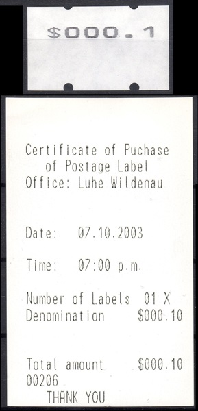 Druckprobe, Specimen - weißes Papier mit Gummierung $ 000.1 mit Quittung 07.10.2003 |