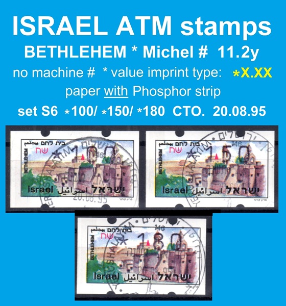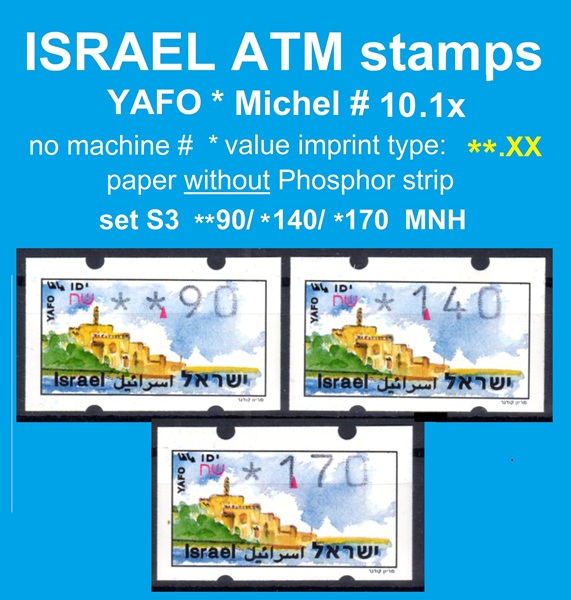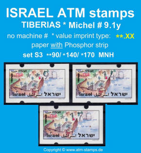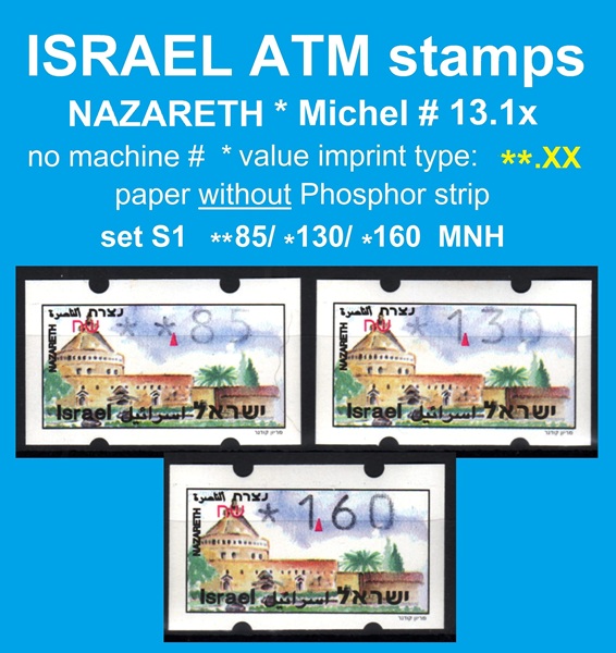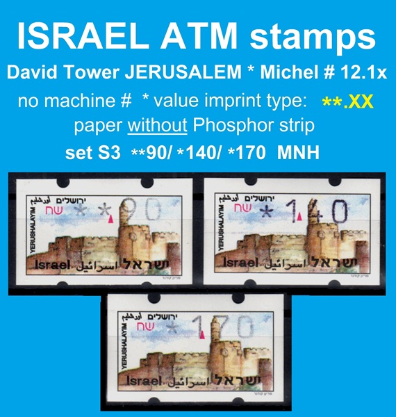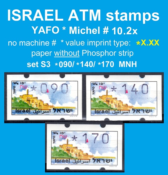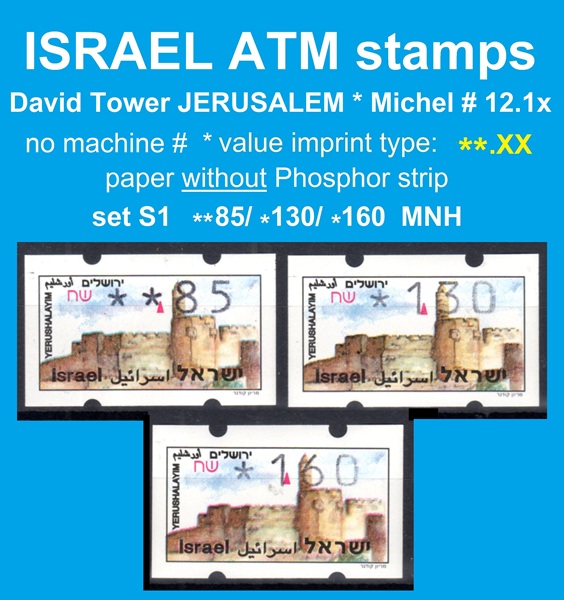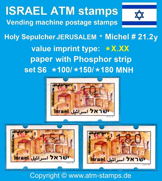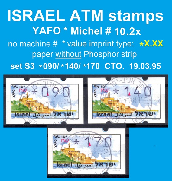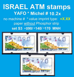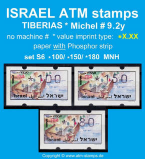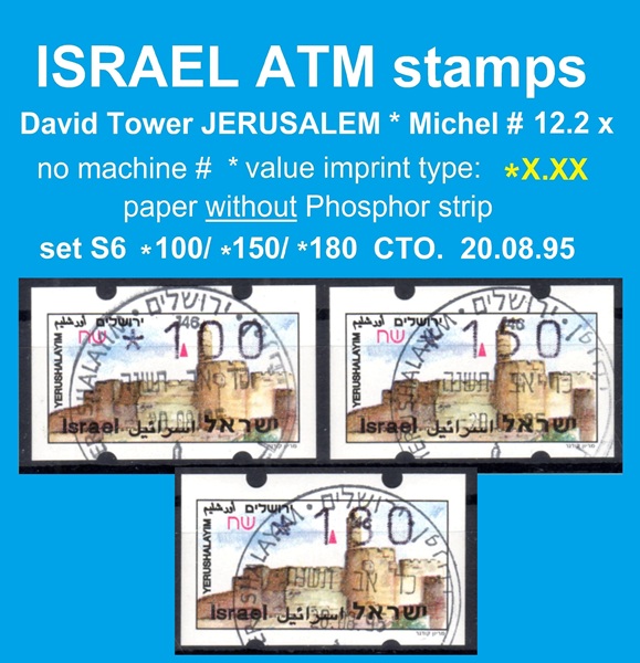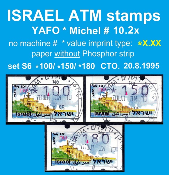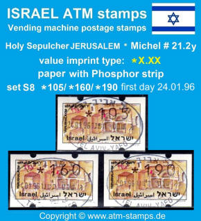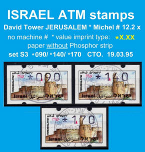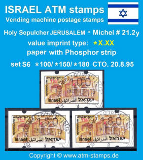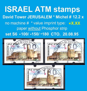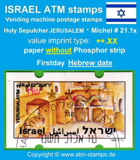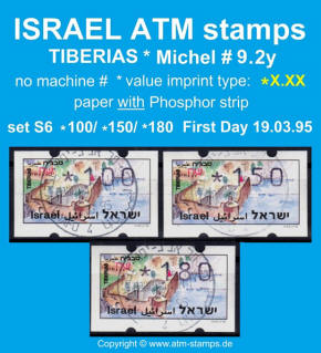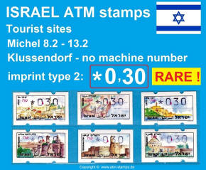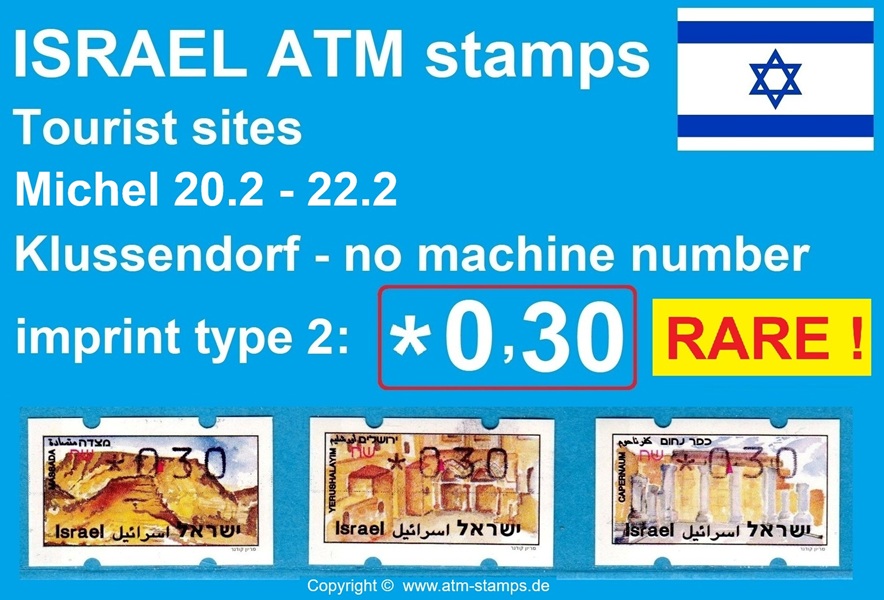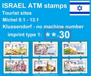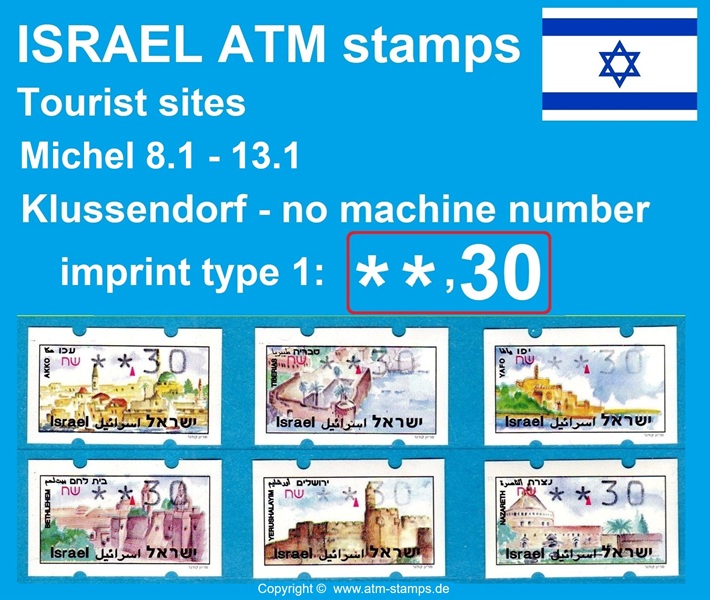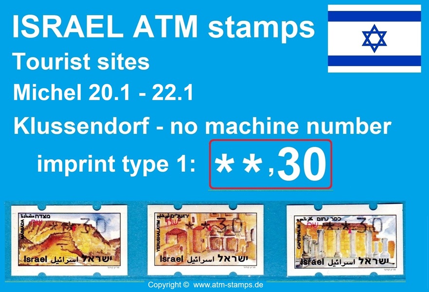 Am 21.06.1994 startete die Post mit den ersten sechs Ausgaben Touristische Orte, die bis 1997 insgesamt 12 verschiedene touristische Orte und Sehenswürdigkeiten zeigen. Alle Vordrucke wurden im Buchdruck, zum Teil mit und zum Teil ohne vorderseitigen Phosphorstreifen von Glilon Printers, Tel Aviv hergestellt. Die Postverwaltung setzte für diese ersten sechs Ausgaben neben Schalterwertzeichendrucker Modell 829 (ohne Automatennummern) auch Münzwertzeichendruckern Modell 696 mit nummerierten Klischees 001-045 vom deutschen Hersteller Klüssendorf ein. Die Münzwertzeichendrucker Modell 696 hatten keine programmierten Tastenwertstufen sondern eine 13er-Tastatur mit der alle Wertstufen zwischen 0.05 bis 15.00 NIS. in Stufen von 0.05 NIS ausgewählt werden konnten. Zuviel bezahlter Betrag wurde nicht als Münzgeld sondern als ATM erstattet. Die Versandstelle hat die Ausgaben mit Automatennummer nicht angeboten. Die ATM waren nur an den Standortautomaten erhältlich. Druckbild