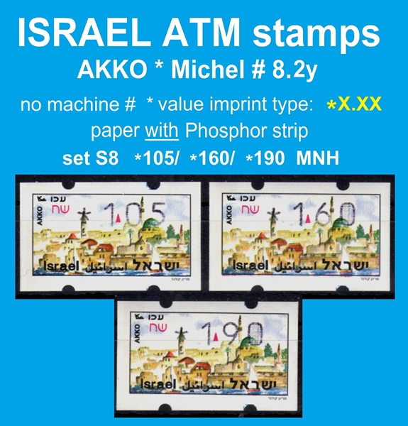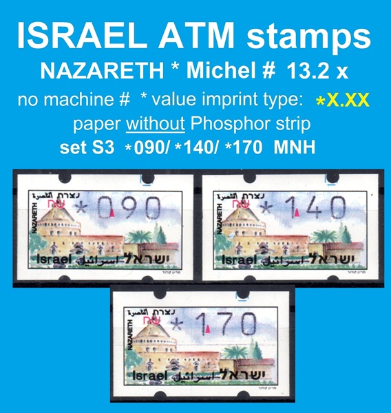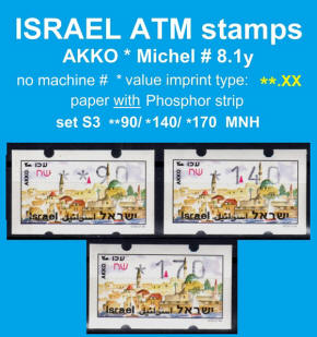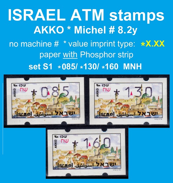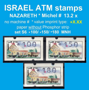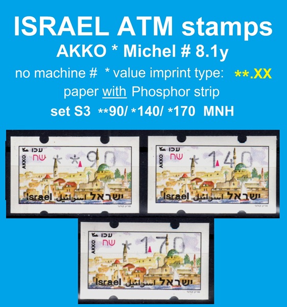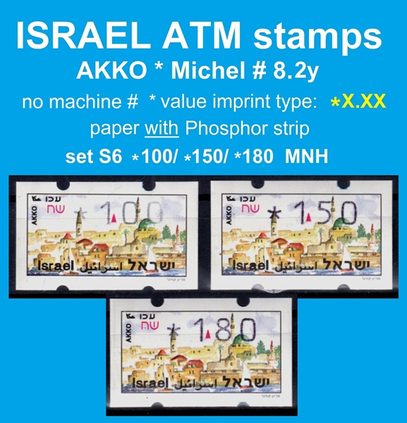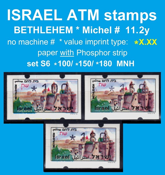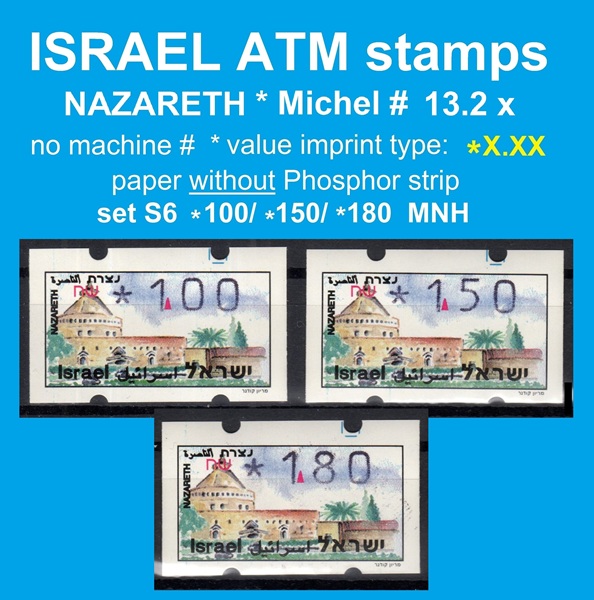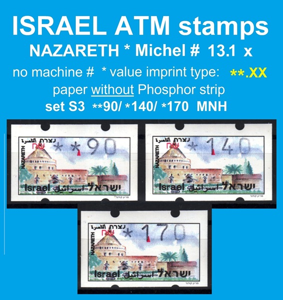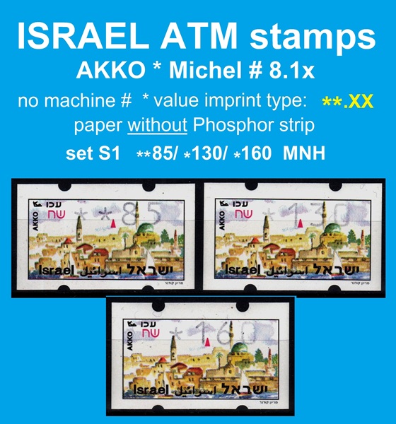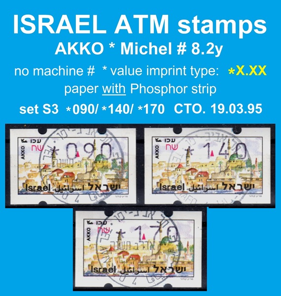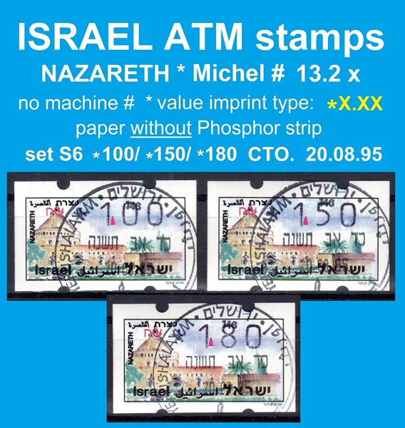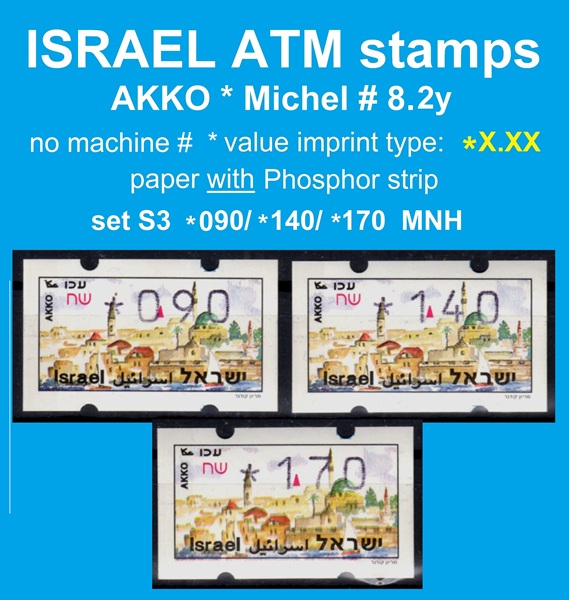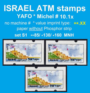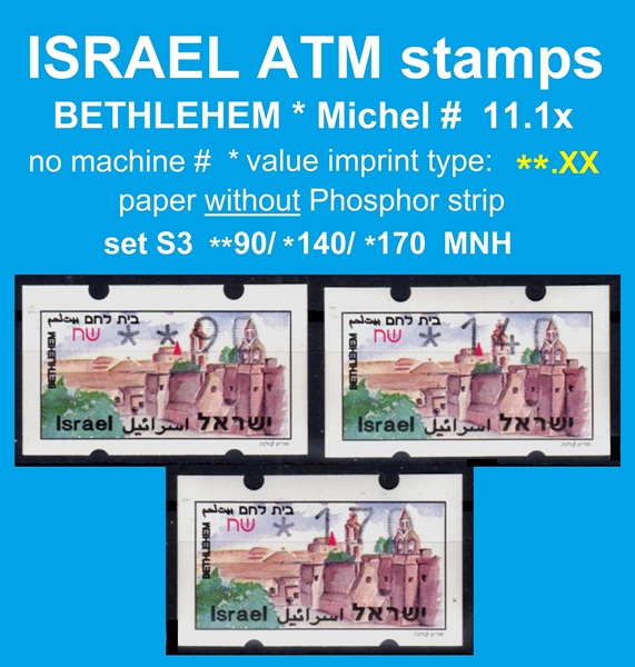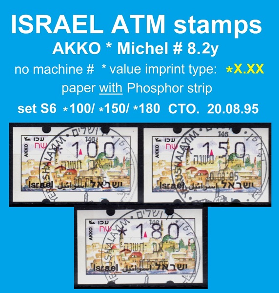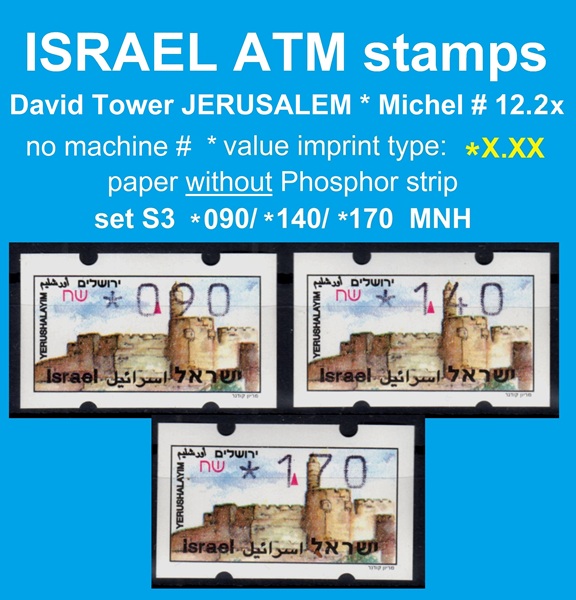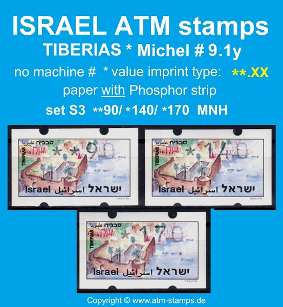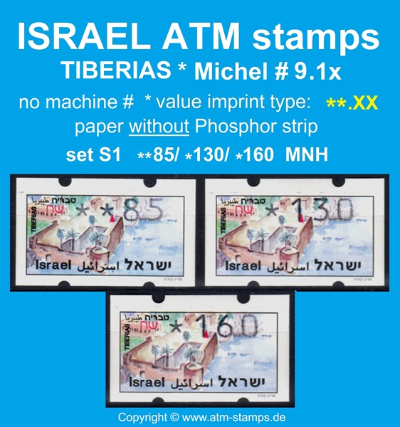 Am 21.06.1994 startete die Post mit den ersten sechs Ausgaben Touristische Orte, die bis 1997 insgesamt 12 verschiedene touristische Orte und Sehenswürdigkeiten zeigen. Alle Vordrucke wurden im Buchdruck, zum Teil mit und zum Teil ohne vorderseitigen Phosphorstreifen von Glilon Printers, Tel Aviv hergestellt. Die Postverwaltung setzte für diese ersten sechs Ausgaben neben Schalterwertzeichendrucker Modell 829 (ohne Automatennummern) auch Münzwertzeichendruckern Modell 696 mit nummerierten Klischees 001-045 vom deutschen Hersteller Klüssendorf ein. Die Münzwertzeichendrucker Modell 696 hatten keine programmierten Tastenwertstufen sondern eine 13er-Tastatur mit der alle Wertstufen zwischen 0.05 bis 15.00 NIS. in Stufen von 0.05 NIS ausgewählt werden konnten. Zuviel bezahlter Betrag wurde nicht als Münzgeld sondern als ATM erstattet. Die Versandstelle hat die Ausgaben mit Automatennummer nicht angeboten. Die ATM waren nur an den Standortautomaten erhältlich. Druckbild