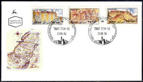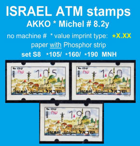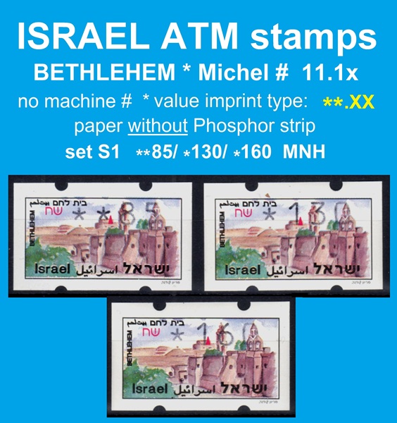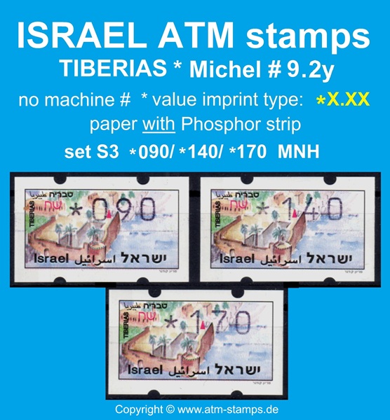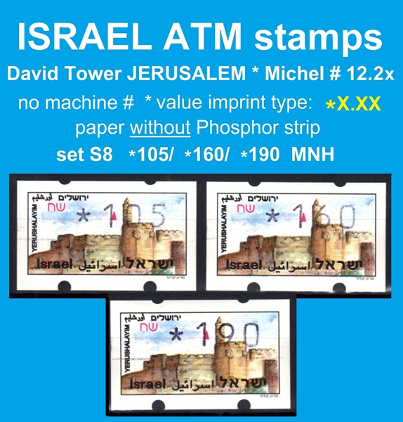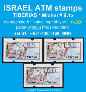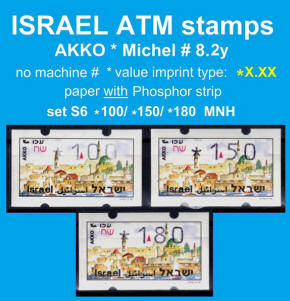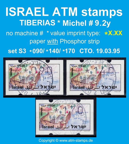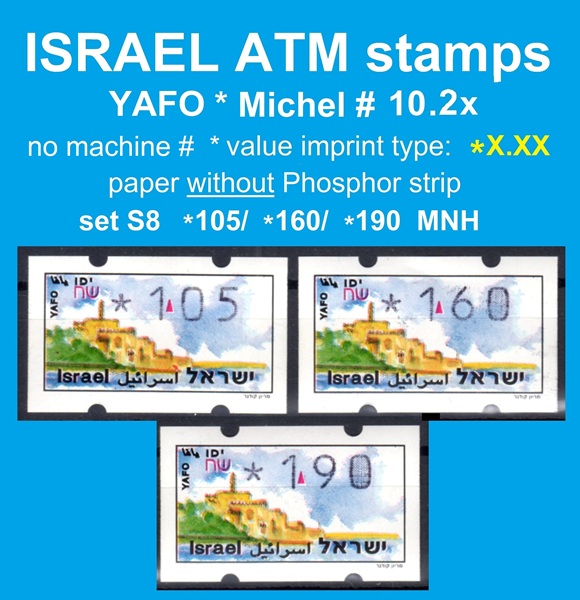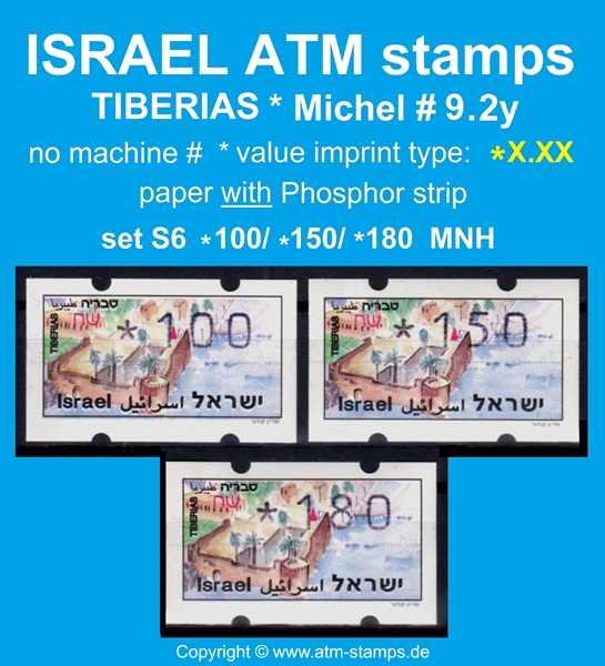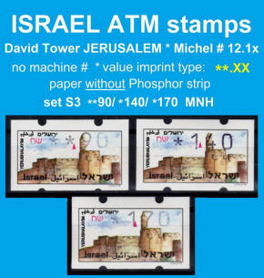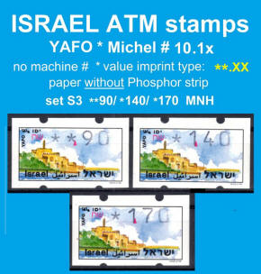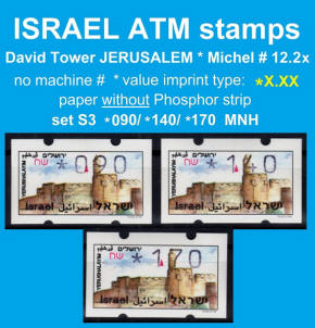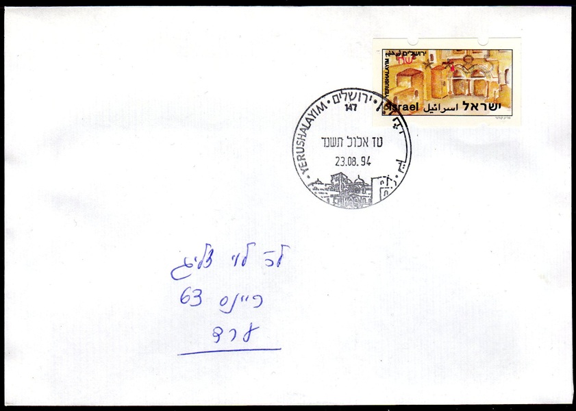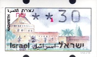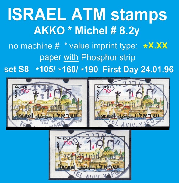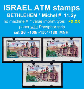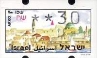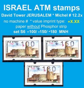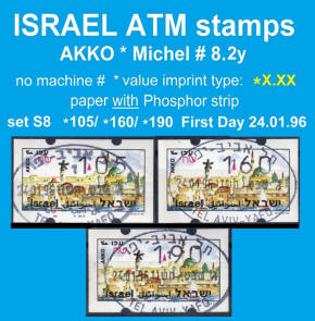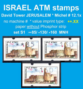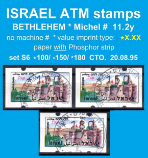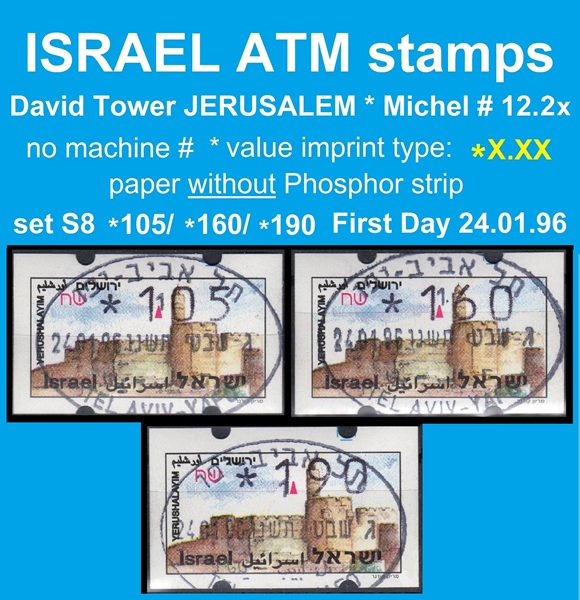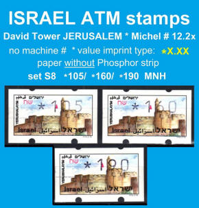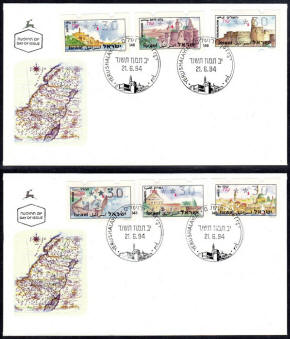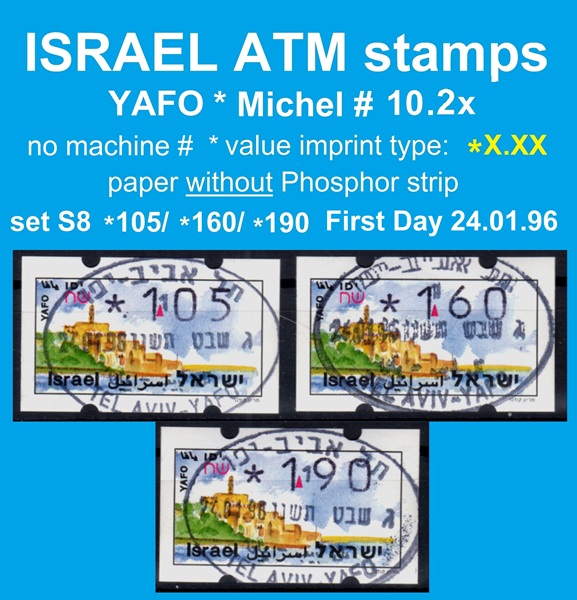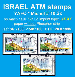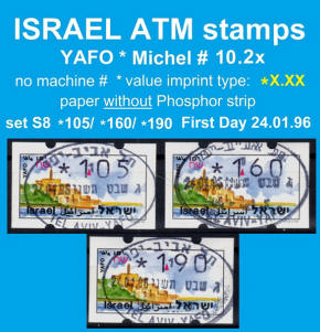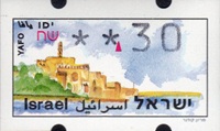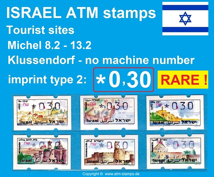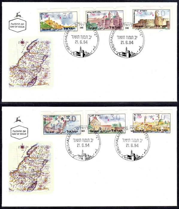 Am 21.06.1994 startete die Post mit den ersten sechs Ausgaben Touristische Orte, die bis 1997 insgesamt 12 verschiedene touristische Orte und Sehenswürdigkeiten zeigen. Alle Vordrucke wurden im Buchdruck, zum Teil mit und zum Teil ohne vorderseitigen Phosphorstreifen von Glilon Printers, Tel Aviv hergestellt. Die Postverwaltung setzte für diese Ausgaben Schalterwertzeichendrucker Modell 829 (ohne Automatennummern) vom deutschen Hersteller Klüssendorf ein. Die Schalterwertzeichendrucker waren nur bei der Versandstelle bzw. Philatelie Service der Post im Einsatz und hatten ein Wertespektrum von 0.05 bis 99.95 NIS in Stufen von 0.05 NIS. allerdings sollten nur Wertstufen von 0.30 NIS. und zwischen 0.85 NIS. bis 15.00 NIS in Stufen von 0.05 NIS abgegeben werden. Die Versandstelle lieferte diese Ausgaben in verschiedenen Satz-Zusammenstellungen. Amtliche FDC wurden mit Michel 8.1 x - 13.1 x jeweils mit Einzelmarken 0.30 NIS. auf 2 FDC hergestellt. Im Jahr 1995 wurde ein neuer Schalterdrucker Modell 847 in der Versandstelle in Betrieb genommen. Dabei ist das Druckbild bei Wertstufen unter x1,00 NIS abweichend zum alten Drucker Modell 829. Druckbild Modell