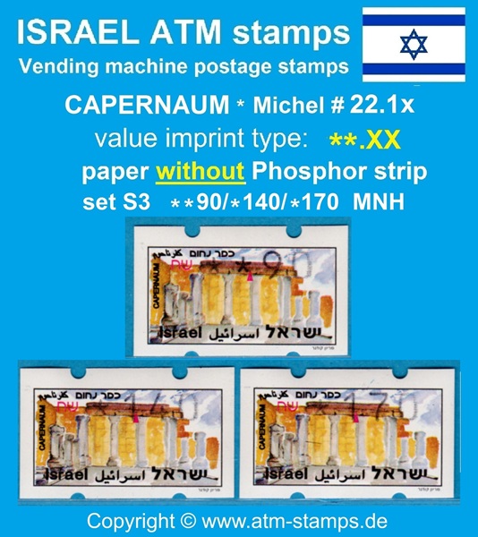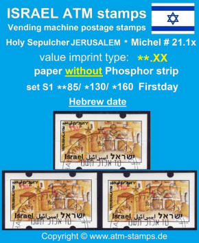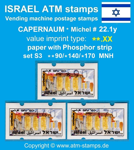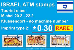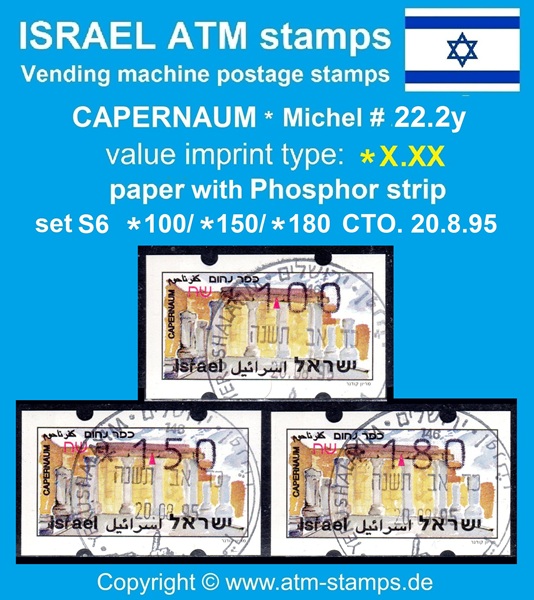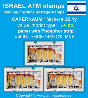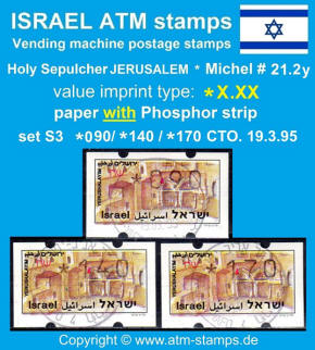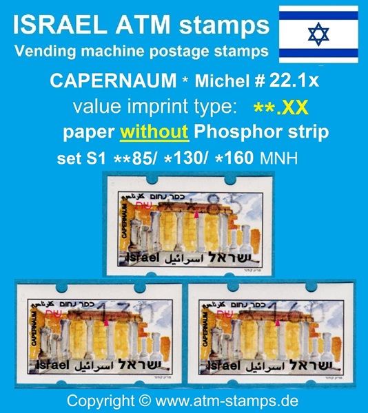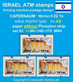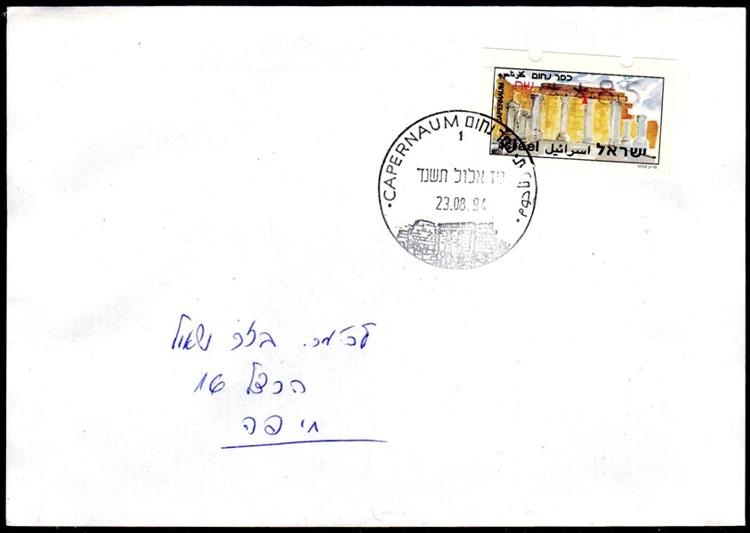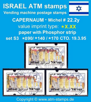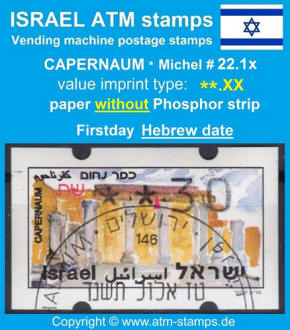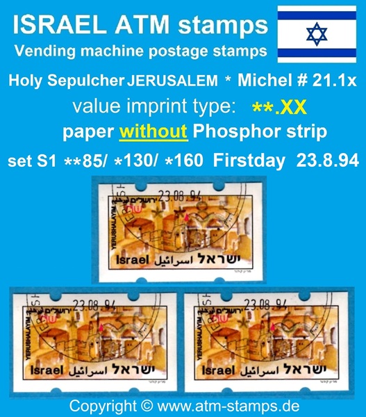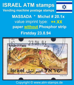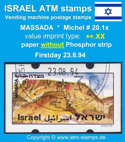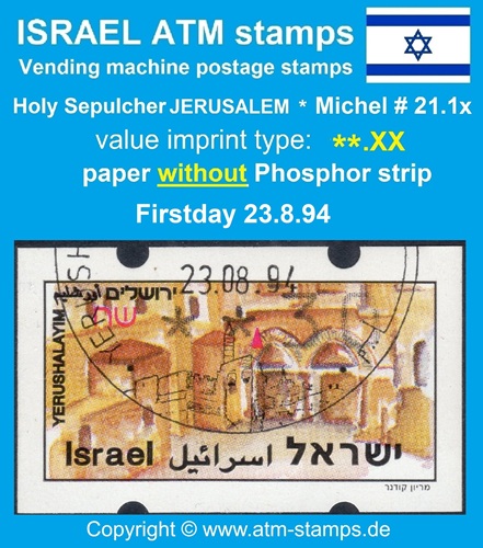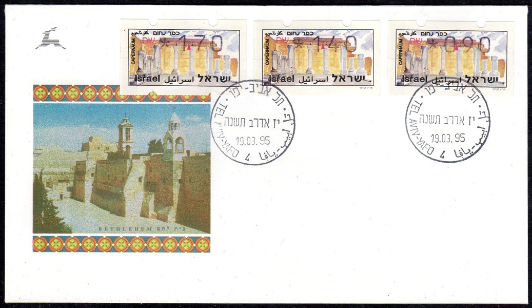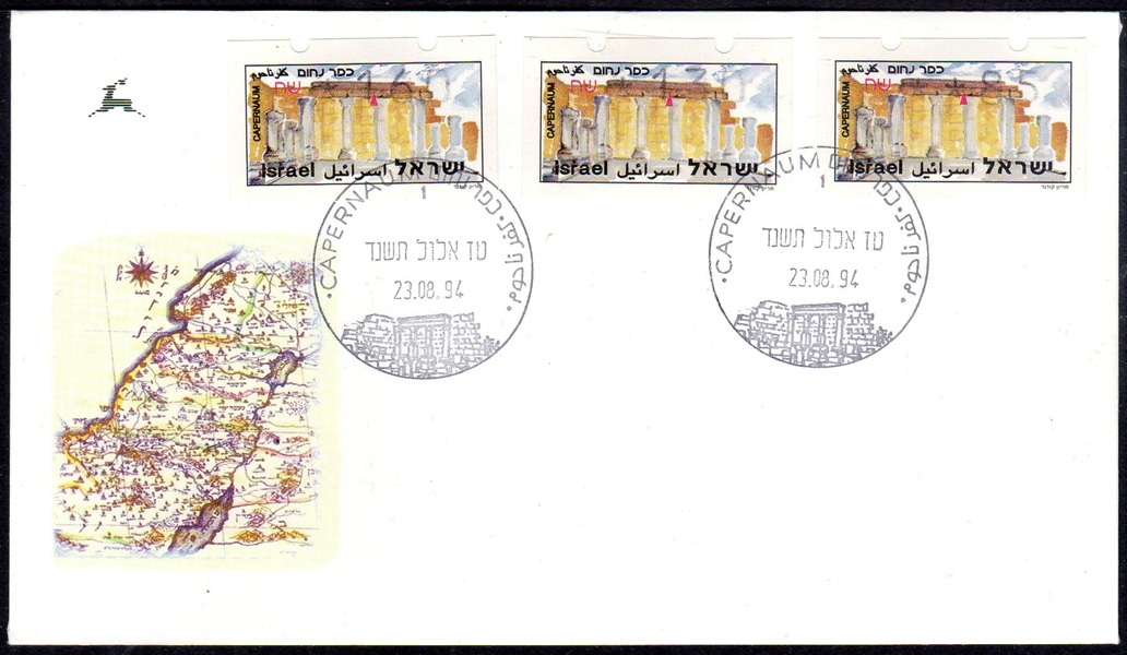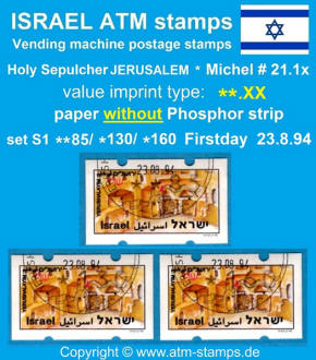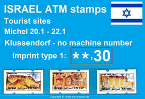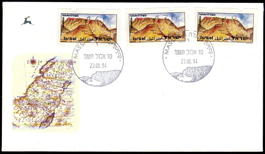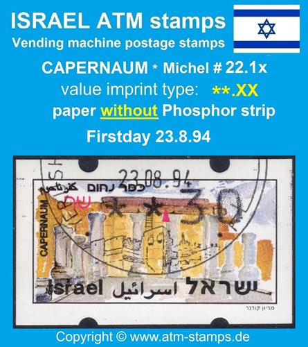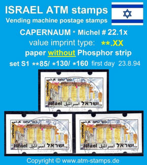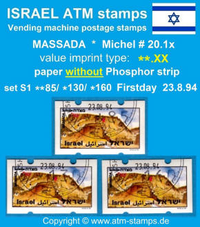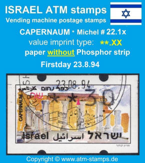 Am 23.08.1994 setzte die Post die Ausgaben der Touristische Orte mit den Ausgaben Massada, Jerusalem-Grabeskirche und Kapernaum fort. Alle Vordrucke wurden im Buchdruck, zum Teil mit und zum Teil ohne vorderseitigen Phosphorstreifen von Glilon Printers, Tel Aviv hergestellt. Die Postverwaltung setzte für diese drei Ausgaben wieder Schalterwertzeichendrucker Modell 829 (ohne Automatennummern) vom deutschen Hersteller Klüssendorf ein. Die Schalterwertzeichendrucker waren nur bei der Versandstelle bzw. Philatelie Service der Post im Einsatz und hatten ein Wertespektrum von 0.05 bis 99.95 NIS in Stufen von 0.05 NIS. allerdings sollten nur Wertstufen von 0.30 NIS. und zwischen 0.85 NIS. bis 15.00 NIS in Stufen von 0.05 NIS abgegeben werden. Nur die Ausgabe Kapernaum gab es dann ab 1997 auch aus einem Münzwertzeichendrucker Modell 696 mit der Automatennummer 026. Die Versandstelle lieferte diese drei Ausgaben nur ohne Automatennummern in verschiedenen Satz-Zusammenstellungen. Amtliche FDC wurden mit Michel 20.1 x - 22.1 x jeweils Einzelmarken 0.30 NIS. auf einem FDC hergestellt. Im Jahr 1995 wurde ein neuer Schalterdrucker Modell 847 in der Versandstelle in Betrieb genommen. Dabei ist das Druckbild bei Wertstufen unter x1,00 NIS abweichend zum alten Drucker Modell 829. Druckbild Modell