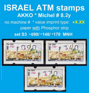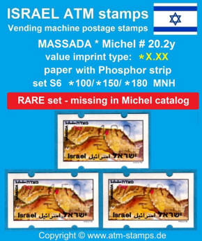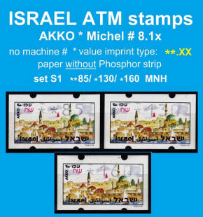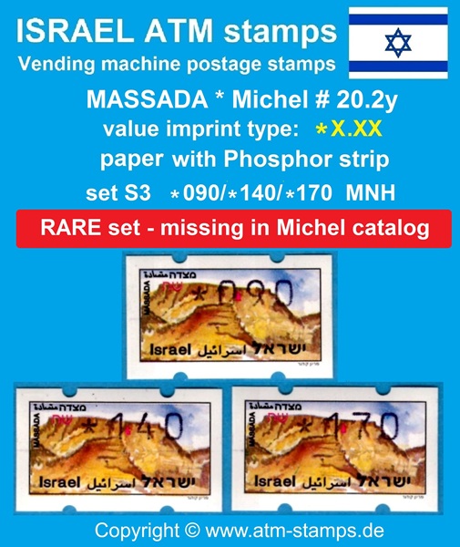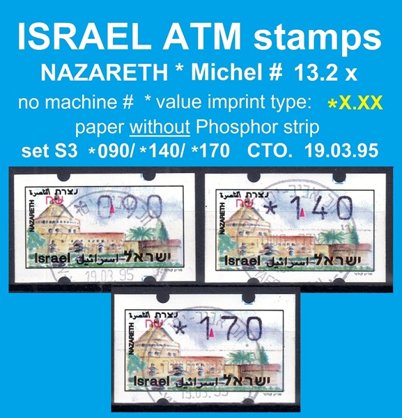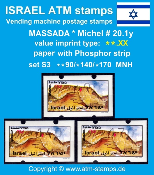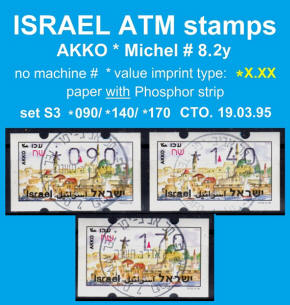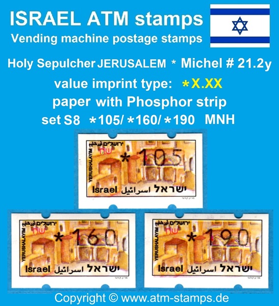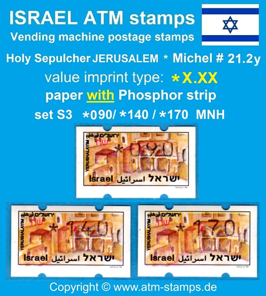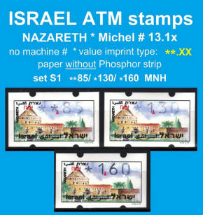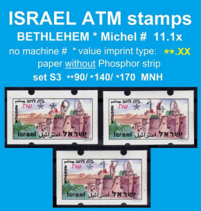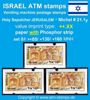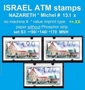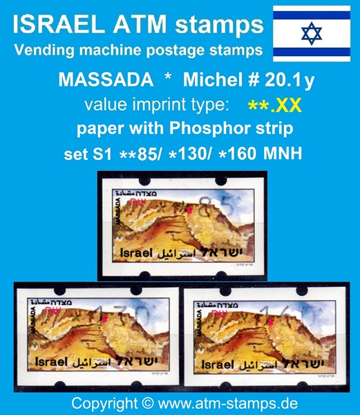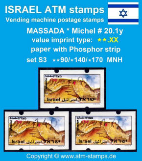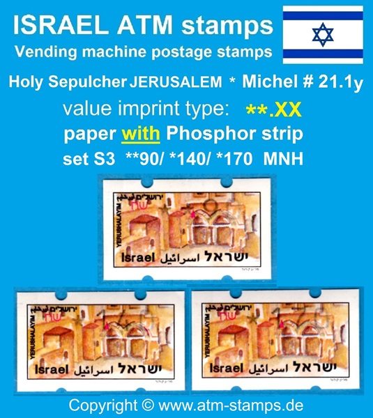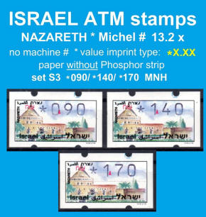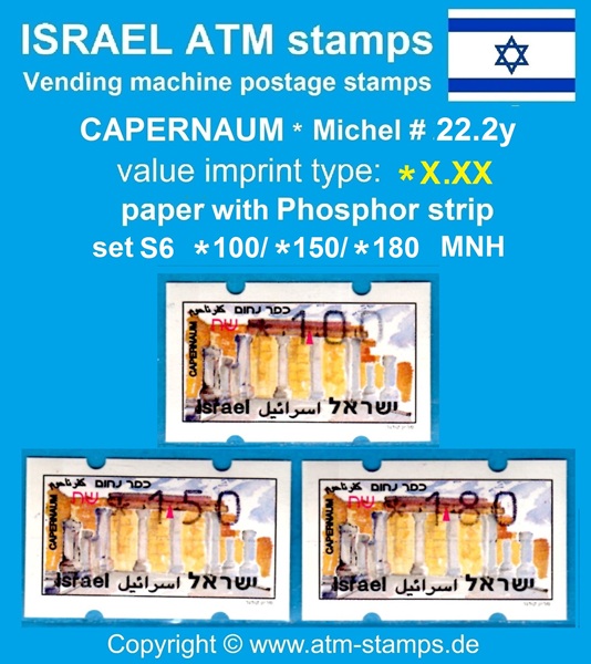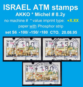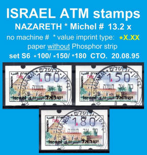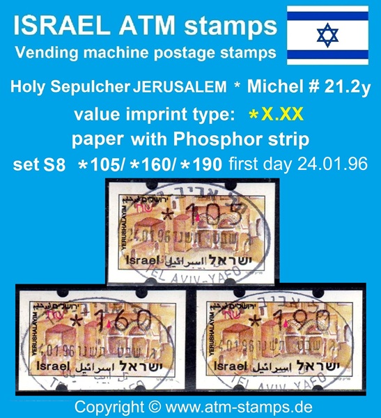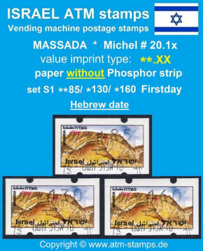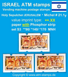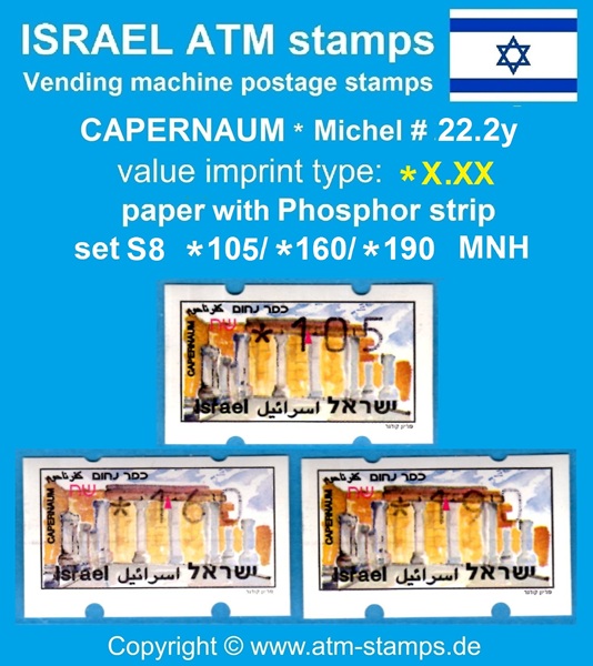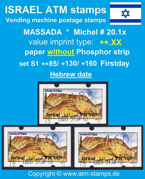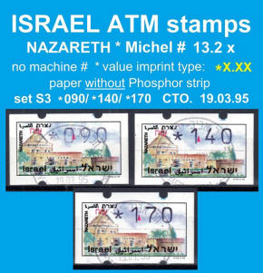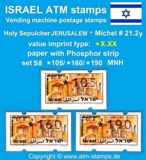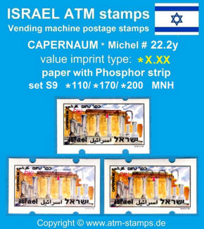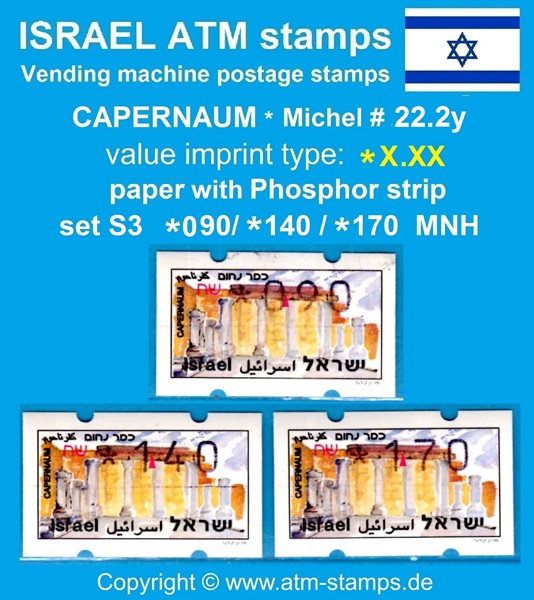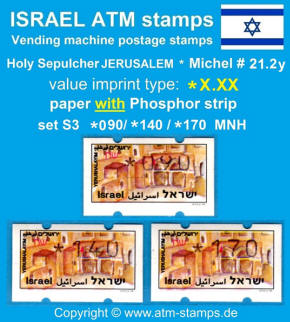 Am 23.08.1994 setzte die Post die Ausgaben der Touristische Orte mit den Ausgaben Massada, Jerusalem-Grabeskirche und Kapernaum fort. Alle Vordrucke wurden im Buchdruck, zum Teil mit und zum Teil ohne vorderseitigen Phosphorstreifen von Glilon Printers, Tel Aviv hergestellt. Die Postverwaltung setzte für diese drei Ausgaben wieder Schalterwertzeichendrucker Modell 829 (ohne Automatennummern) vom deutschen Hersteller Klüssendorf ein. Die Schalterwertzeichendrucker waren nur bei der Versandstelle bzw. Philatelie Service der Post im Einsatz und hatten ein Wertespektrum von 0.05 bis 99.95 NIS in Stufen von 0.05 NIS. allerdings sollten nur Wertstufen von 0.30 NIS. und zwischen 0.85 NIS. bis 15.00 NIS in Stufen von 0.05 NIS abgegeben werden. Nur die Ausgabe Kapernaum gab es dann ab 1997 auch aus einem Münzwertzeichendrucker Modell 696 mit der Automatennummer 026. Die Versandstelle lieferte diese drei Ausgaben nur ohne Automatennummern in verschiedenen Satz-Zusammenstellungen. Amtliche FDC wurden mit Michel 20.1 x - 22.1 x jeweils Einzelmarken 0.30 NIS. auf einem FDC hergestellt. Im Jahr 1995 wurde ein neuer Schalterdrucker Modell 847 in der Versandstelle in Betrieb genommen. Dabei ist das Druckbild bei Wertstufen unter x1,00 NIS abweichend zum alten Drucker Modell 829. Druckbild Modell