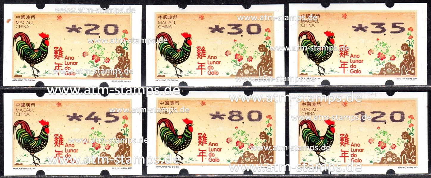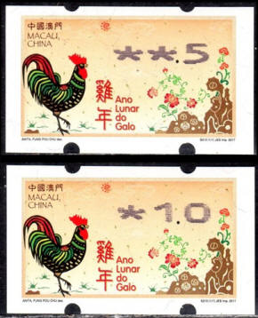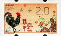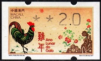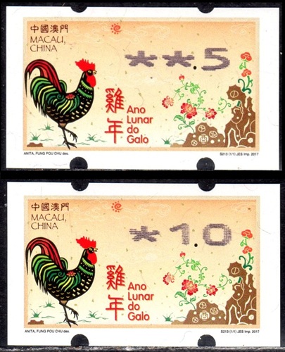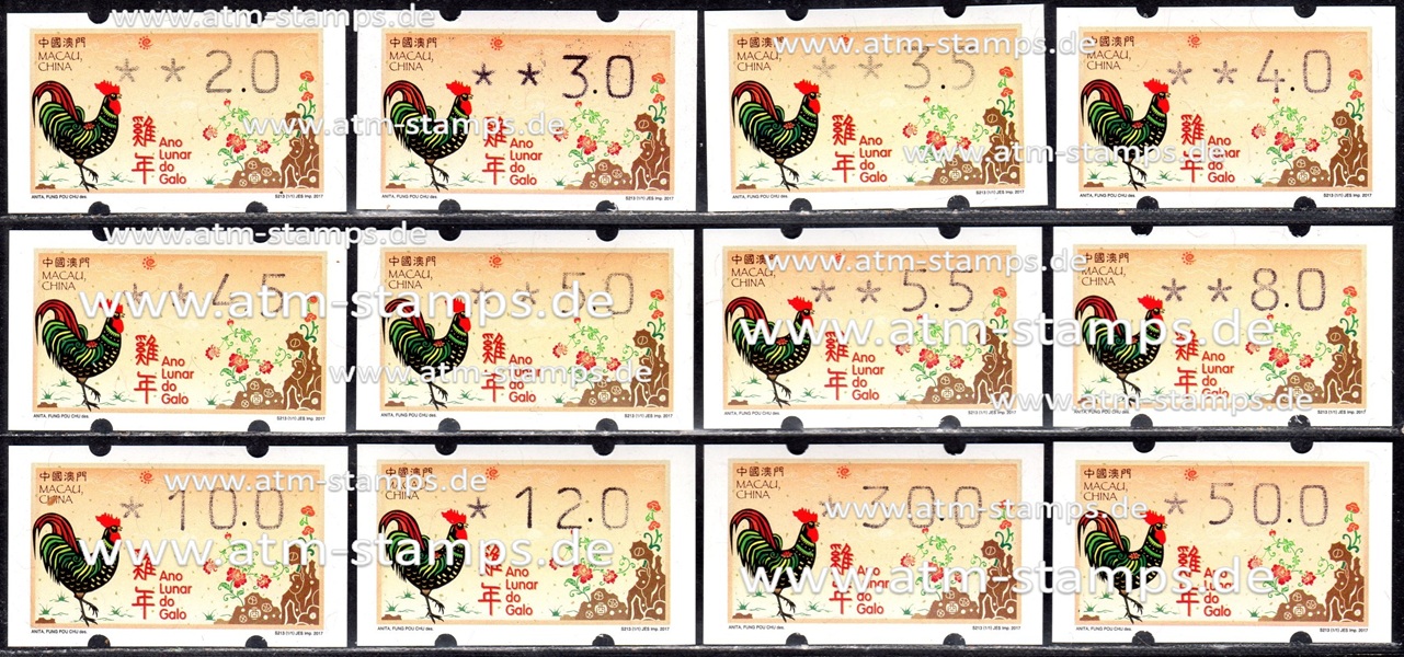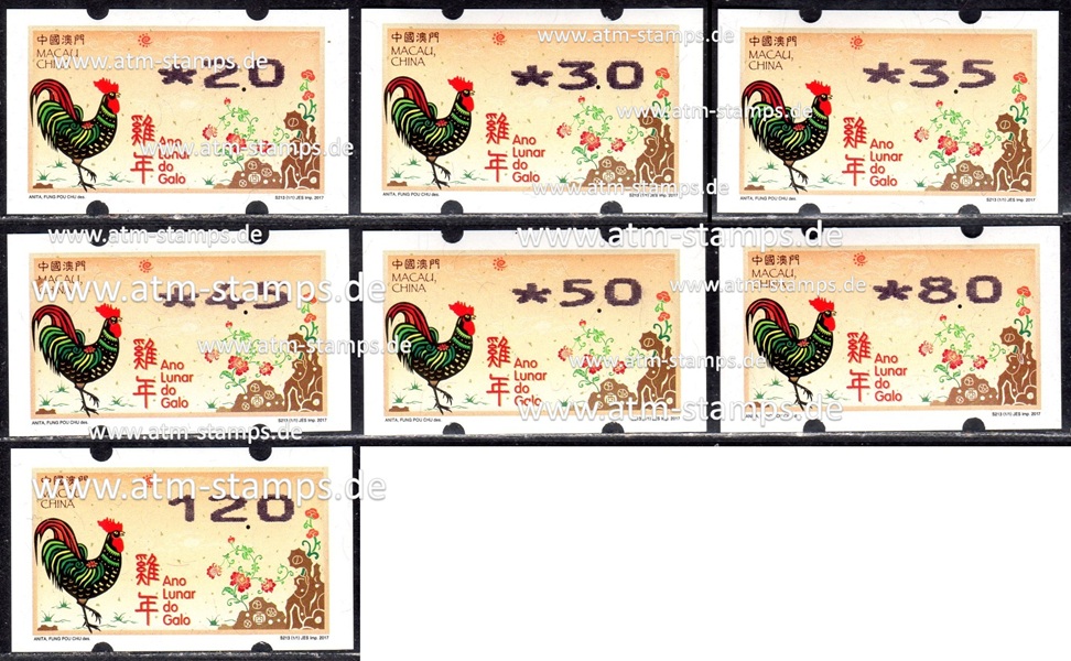 Am 17.05.17 erschien die Ausgabe zum Jahr des Hahns aus dem 12 jährigen Zyklus der Chinesischen Tierkreiszeichen. Die Vordrucke wurden wieder in den Klüssendorf und Nagler Automaten verwendet. Anfang Dezember 2016 teilte die CTT Macau mit, dass der Verkauf von 1.0 P. und 1.5 P. Wertstufen ab dem 31.12.2016 an allen Briefmarkenautomaten eingestellt wird. Damit hat der Klüssendorf Tastensatz somit 12 Wertstufen 2.0 - 50.0 P. der Nagler N104 Tastensatz 6 Wertstufen 2.0 - 12.0 P sowie die beiden Restwerte **.5 P. 1.0 P. Der Tastensatz der Nagler N714 Geräte neu 7 Wertstufen 2.0 P. - 12.0 P. Die Versandstelle hatte von Michel 11.1 den Satz 2.0, 3.0, 3.5, 4.5 P. in postfrisch und auf amtlichen FDC (Auflage 5000) angeboten. Die Vordrucke wurden von Royal Joh. Enschedé, Niederlande im Offset-Lithografie Druckverfahren (Auflage 1.000.000 Vordrucke) hergestellt. Jede 5.Marke mit rückseitiger Zählnummer. Die Macau Post meldete am 25.05.2017, dass die Ausgabe bald ausverkauft sein wird! |