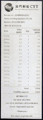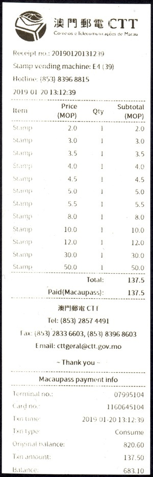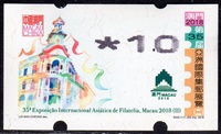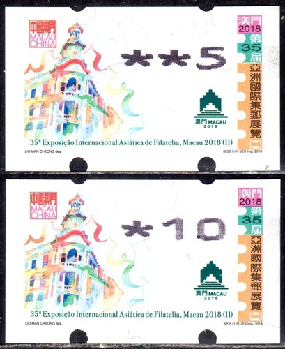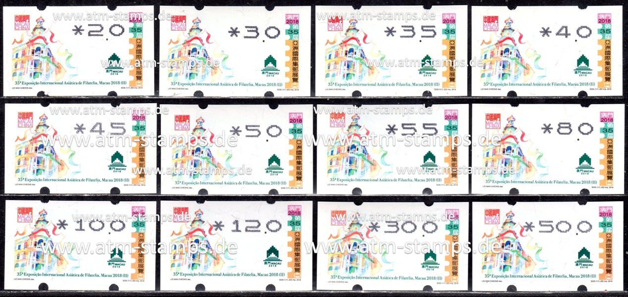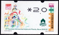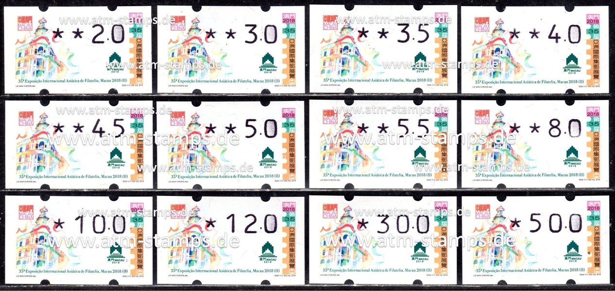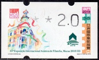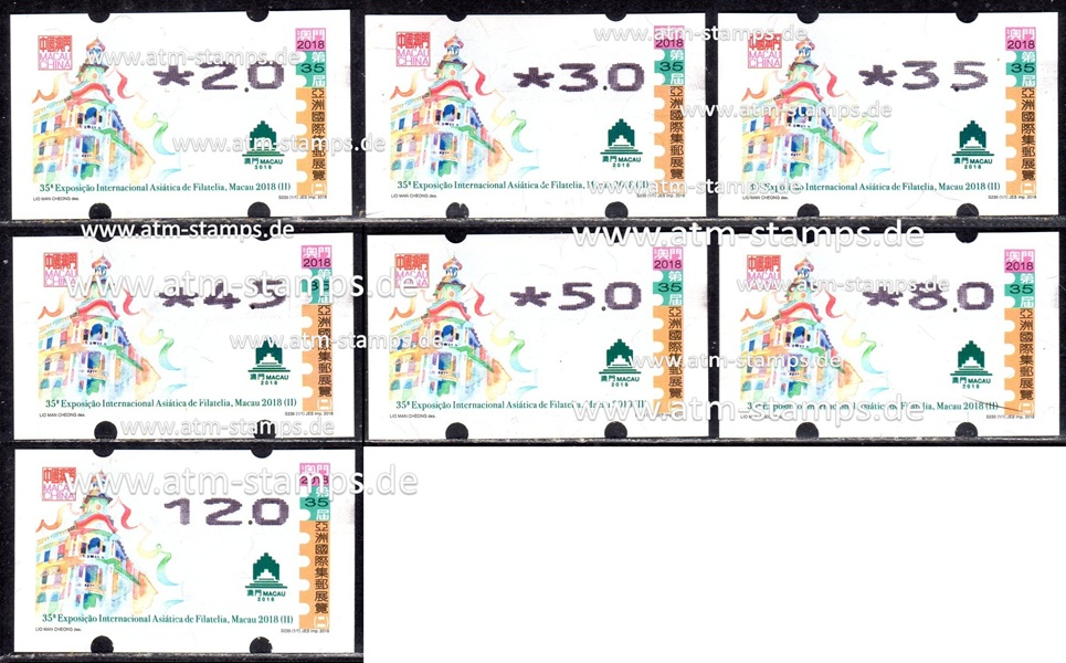 Diese Ausgabe gab es zum Anlass der Briefmarkenausstellung Macau 2018 - 35th Asian International Stamp Exhibition die vom 21.-24.09.2018 stattfand. Diese Sonderausgabe war aus Klüssendorf und Nagler Geräten sowie erstmals auch aus NewVision Automaten erhältlich. Die neuen NewVision Elite Automaten werden im Indoor Betrieb und die NewVision Prestige Automaten speziell für den Outdoor Betrieb genutzt. Die Geräte hatten 12 programmierte Tastenwertstufen 2.0 - 50.0 P. und gaben auf Wunsch eine Kaufquittung ab. Die Versandstelle hatte von Michel 13.1 den Satz 2.0, 3.0, 3.5, 4.5 P. in postfrisch und auf amtlichen FDC (Auflage 5500) angeboten. Die Vordrucke wurden von Royal Joh. Enschedé, Niederlande im Offset-Lithografie Druckverfahren (Auflage 1.500.000 Vordrucke) hergestellt. Jede 5.Marke mit rückseitiger Zählnummer. Die Macau Post meldete am 30.11.2018, dass die Ausgabe bald ausverkauft sein wird! |