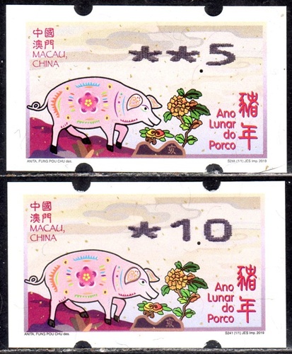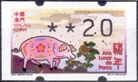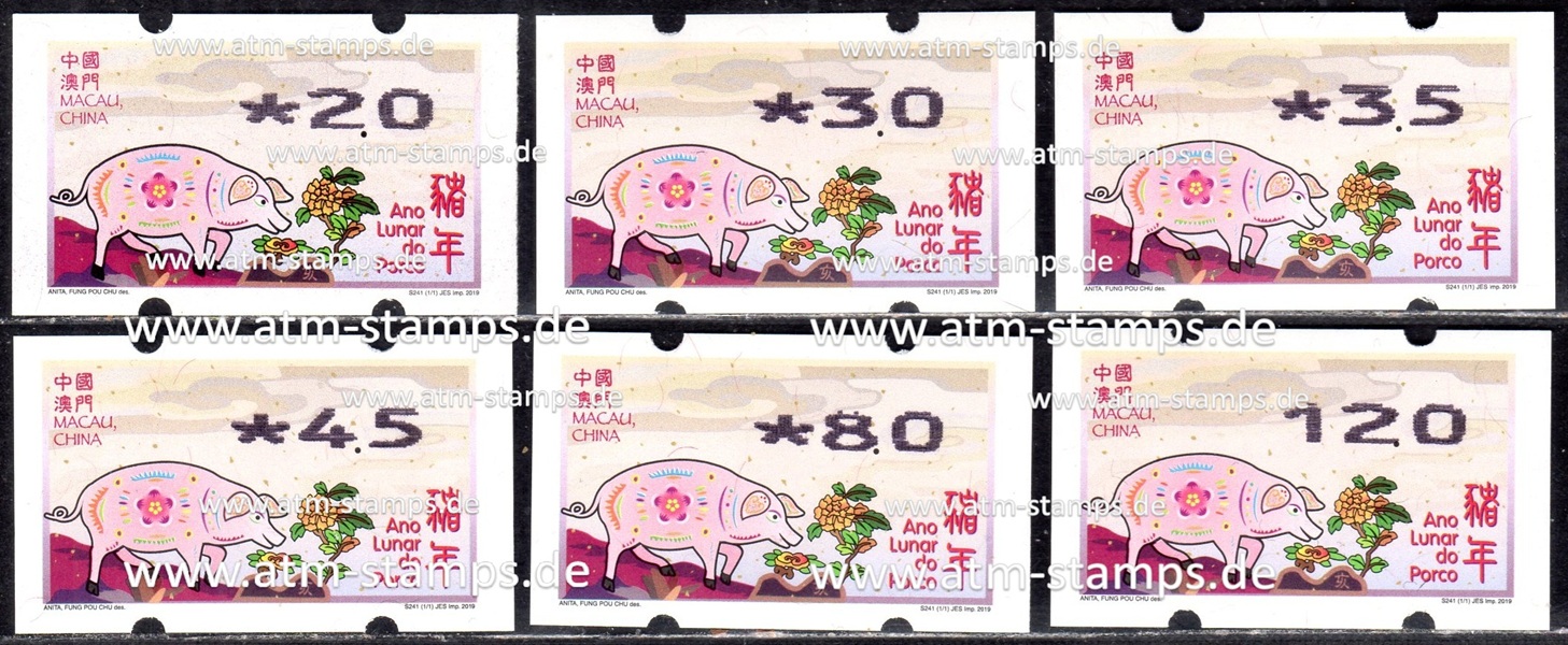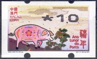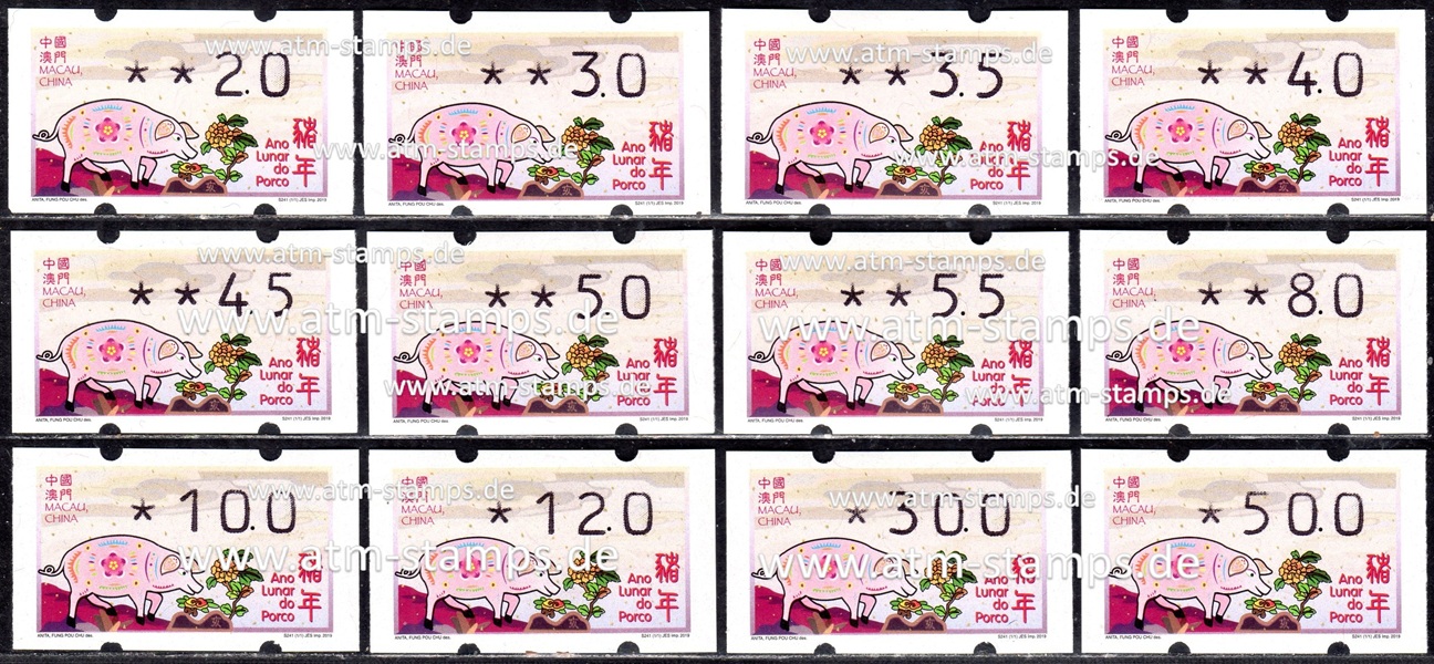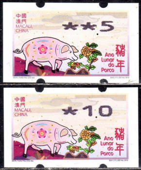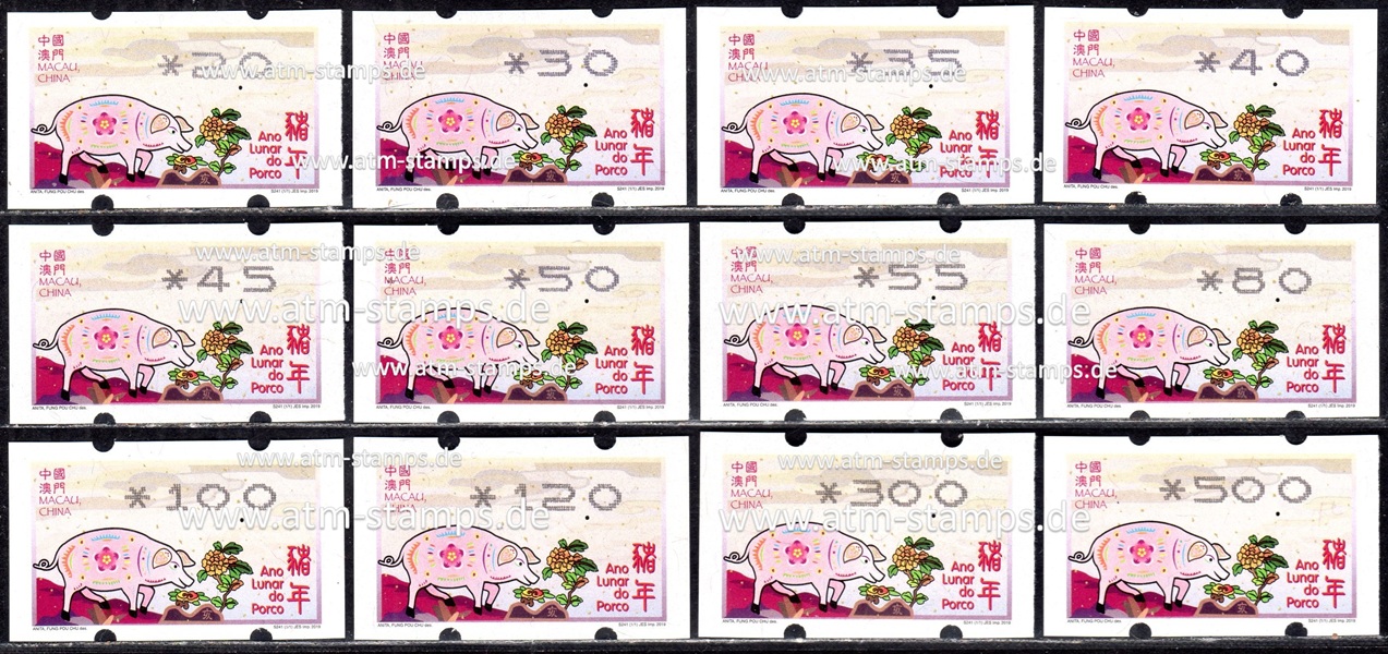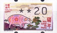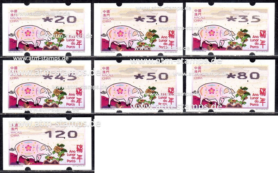 Aus dem 12 jährigen Zyklus der Chinesischen Tierkreiszeichen erschien diese Ausgabe zum Jahr des Schweines am 10.01.2019. Die Vordrucke wurden wieder in den Klüssendorf und Nagler Automaten verwendet und erstmals bei einer Tierkreiszeichen Ausgabe auch in NewVision Automaten. Der Klüssendorf Tastensatz umfasste 12 Wertstufen 2.0 - 50.0 P. der Nagler N104 Tastensatz 6 Wertstufen 2.0 - 12.0 P sowie die beiden Restwerte **.5 P. 1.0 P. Der Tastensatz der Nagler N714 Geräte 7 Wertstufen 2.0 P. - 12.0 P. und die NewVision Geräte hatten 12 Wertstufen im Tastensatz 2.0 - 50.0 P. Die Versandstelle hatte von Michel 14.1 den Satz 2.0, 3.0, 3.5, 4.5 P. in postfrisch und auf amtlichen FDC (Auflage 4500) angeboten. Die Vordrucke wurden von Royal Joh. Enschedé, Niederlande im Offset-Lithografie Druckverfahren (Auflage 1.000.000 Vordrucke) hergestellt. Jede 5.Marke mit rückseitiger Zählnummer. Die Macau Post meldete am 17.01.2019, dass die Ausgabe bald ausverkauft sein wird! |