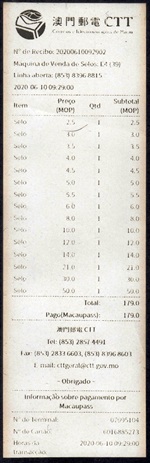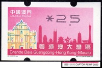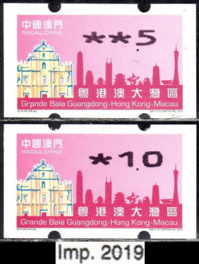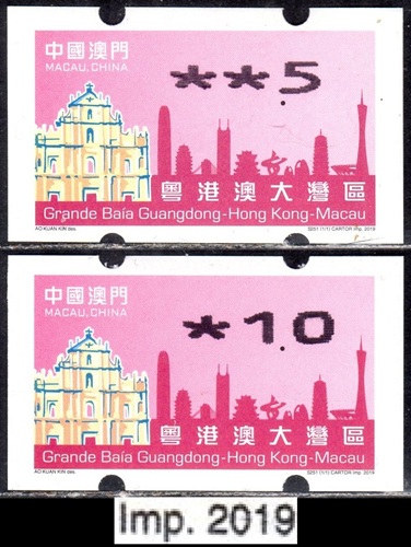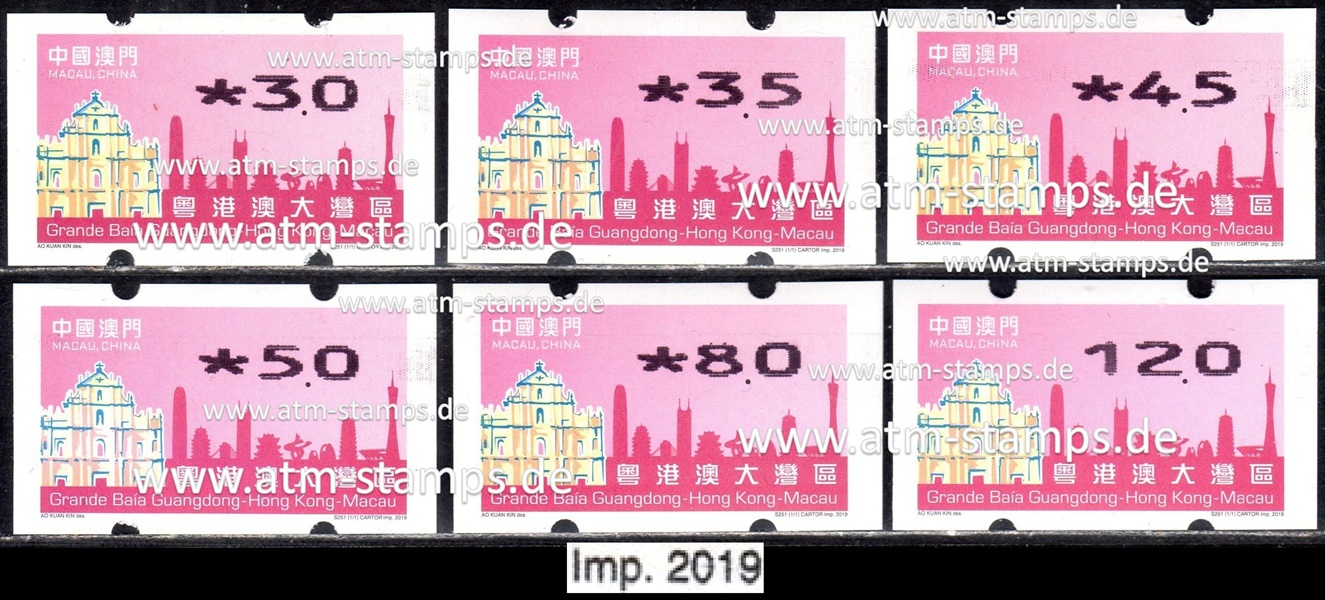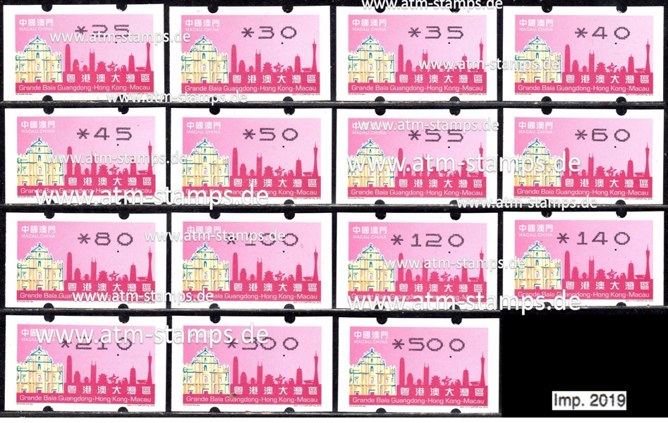 Die Bildgleiche Nachauflage der ATM Dauerausgabe Grande Baía Guangdong-Hong Kong-Macau mit dem Druckvermerk REIMP 2020 erschien am 08.06.2020 aber nur noch aus NewVision Automaten. Der Tastensatz aus NewVision Elite und Prestige Geräten hatte unverändert die 15 Wertstufen 2.5 - 50.0 P. Die Versandstelle hat diese Ausgabe nicht angeboten. Die Vordrucke REIMP 2020 wurden von Cartor Security Printing, Frankreich im Offset-Lithografie Druckverfahren hergestellt. Jede 5.Marke mit rückseitiger Zählnummer. |