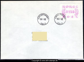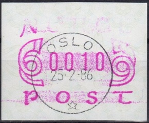 Am 16.10.1986 gab die norwegische Post eine neue Automatenmarke heraus. Die ATM zeigen ein neues Motiv mit Text NORGE NOREG wobei das Papier mit dem Rosettenvordruck nicht geändert wurde. Das neue Druckklischee wurde wieder von dem bekannten norwegischen Briefmarkendesigner Knut Løkke-Sørensen entworfen. Am Ersttag waren landesweit insgesamt 9 Automaten von Typ FE1510 der schweizer Firma Frama in Betrieb. Die Automaten gaben ATM mit breiten Ziffern (3.2) ab und acht der Geräte waren mit braunroten (b) Farbbändern bestückt, nur das Gerät vom Standort Oslo Postterminal Verdiavdelingen hatte ein Farbband in rotlila (d). Die Geräte hatten keine festprogrammierten Tastenwerte sondern eine 12er-Tastatur mit der alle Wertstufen zwischen 10 bis 9990 Øre in Stufen von 10 Øre ausgewählt werden konnten. Neben den 9 Standortautomaten gab es noch ein weiteres Gerät bzw. ein Drucker mit dem die Automatenmarken für den Philatelie Service der Post und den Verkauf am Philatelieschalter hergestellt wurden. Dieser Drucker stand aber nicht beim Philateliedienst der Post sondern bei der Banknotendruckerei der Norwegischen Staatsbank. Am Ersttag, den 16.10.1986 waren beim Philatelie Service und am Philatelieschalter der Post ein Satz mit den Wertstufen 210, 250, 350, 400 (Øre) im Angebot. Außerdem verkaufte die Post einen amtlichen FDC mit diesen Satz. Die ATM vom Philatelie Service der Post hatten schmale Ziffern (3.1) und sind somit leicht von den ATM der Ortsautomaten mit den breiten Ziffern (3.2) zu unterscheiden. Ab dem Tarifwechsel vom 01.03.1988 hatten dann die ATM vom Philatelie Service auch die breiten Ziffern (3.2).