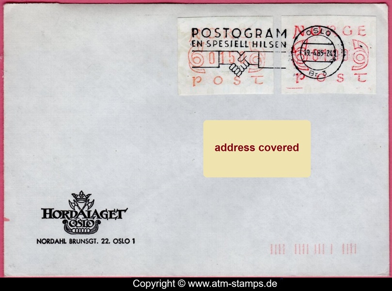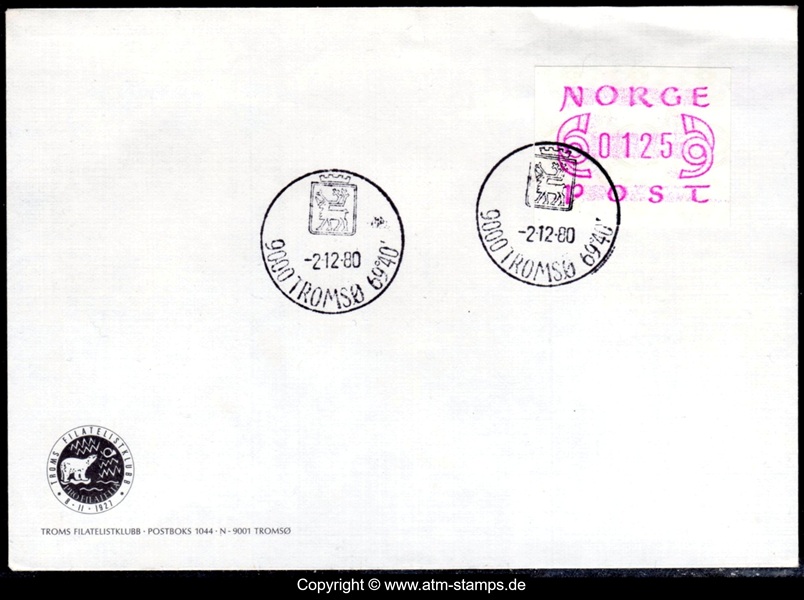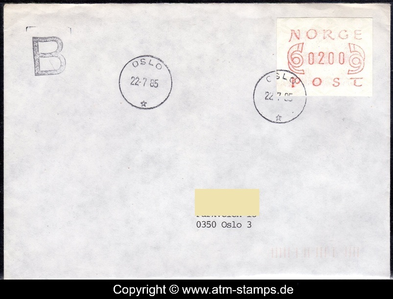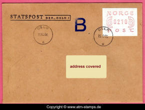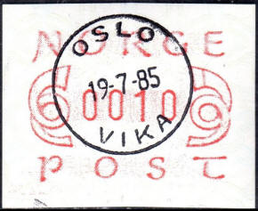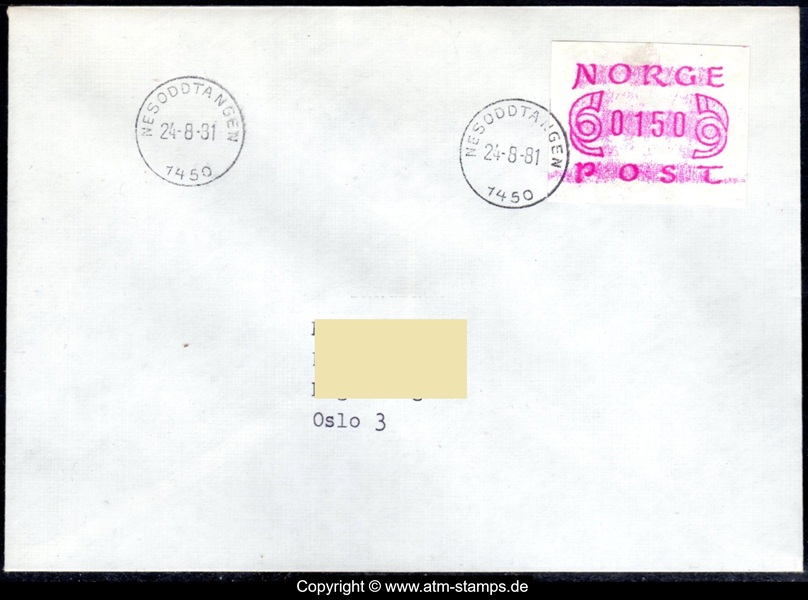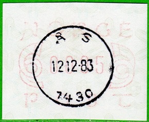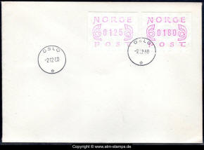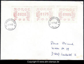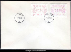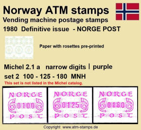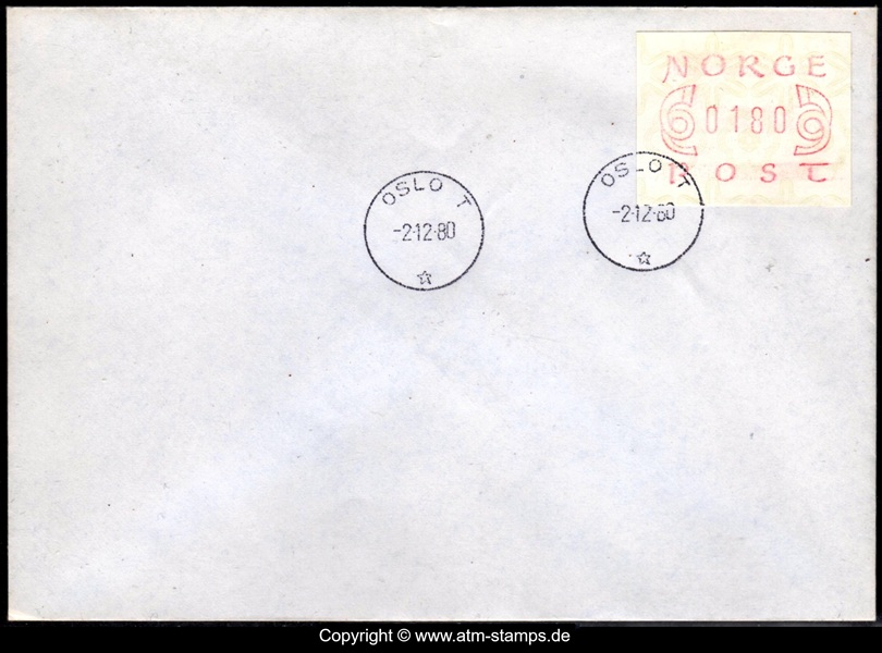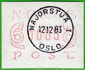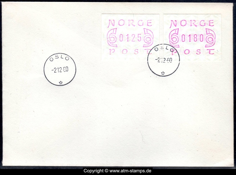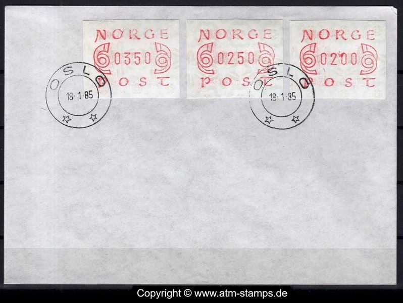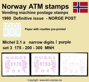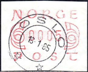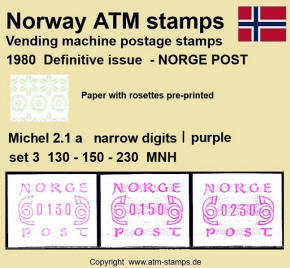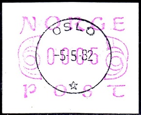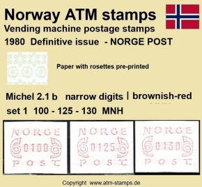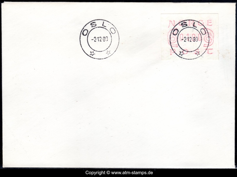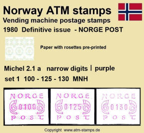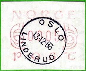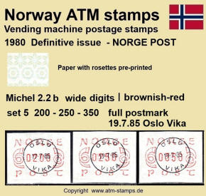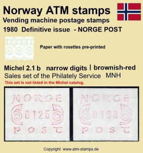 Neben den 35 Standortautomaten gab es noch ein weiteres Gerät bzw. ein Drucker mit dem die Automatenmarken für den Philatelie Service der Post und den Verkauf am Philatelieschalter hergestellt wurden. Dieser Drucker stand aber nicht beim Philateliedienst der Post sondern bei der Banknotendruckerei der Norwegischen Staatsbank. Am Ersttag, dem 02.12.1980 waren bei der Versandstelle und am Philatelieschalter der Post die beiden Wertstufen 125 Øre und 180 Øre erhältlich, außerdem verkaufte die Post einen amtlichen FDC mit diesen beiden ATM, die es sowohl in braunrot (b) als auch lila (a) gab. Ab dem 01.03.1983 hat der Philatelie Service die Werte 200, 250, 350 Øre und ab dem 01.03.1986 die Werte 250, 350, 400 Øre angeboten. Alle vom Philatelie Service angebotenen ATM hatten bis zum Ende der Ausgabe schmale (2.1) Ziffern. Die 35 Standortautomaten FE264 wurden im Sommer 1986 abgebaut, da sie noch die alten Münzen zu 5 und 25 Øre annahmen. Diese zwei Münzen wurden aber bereits 1984 außer Kurs gesetzt. Ein Umbau der Automaten war aber laut Postverwaltung zu teuer. Der letzte Automat FE 264 war bis Ende September 1986 beim Postamt Oslo Sentrum im Einsatz. Im Vorfeld der Michel 3 (Ersttag 16.10.1986) waren die neuen Automaten FE1510 an 9 Standorten, bereits am 15.10.1986 evtl. auch schon früher nochmals mit dieser Ausgabe in Betrieb. Während die meisten Automaten die Michel 2.2 b (breite Ziffern, braunrot) abgaben, wurde zumindest beim Standort Oslo Postterminal Verdiavdelingen bereits ein Farbband in rotlila (d) eingesetzt (Michel 2.2 d). |
