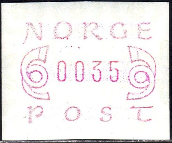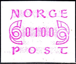 Die norwegische Post verkaufte Briefmarken in gleicher Zeichnung, die wie normale Briefmarken komplett in einer Druckerei im Offsetdruck bzw. UV-Flexodruck für den Wert hergestellt wurden. Es handelt sich um normale Briefmarken, welche nichts mit Automatenmarken zu tun haben. Der Philatelie Service der Post verkaufte solche normalen Briefmarken ab dem 23.10.2008 in den Wertstufen: 7,00, 9,00, und 11,00 Kr. Dann ab dem 02.01.2009 bis Anfang 2012 kamen nochmal insgesamt acht neue Wertstufen dazu. Diese Briefmarken sind allerdings nicht als Hauptausgaben innerhalb der normalen Briefmarken im Michel katalogisiert, sondern wurden in den Automatenmarken-Katalog hinter den ATM als Sonderdrucke "entsorgt". Auch im norwegischen Standardkatalog Norgeskatalogen haben diese Briefmarken keine Hauptnummerierung, sondern sind auch hier hinter den Automatenmarken als Frankeringsetiketter mit PFE-Nummern katalogisiert. Die Begründung im Norgeskatalogen: Die Frankieretiketten gelten auch nicht als Briefmarken, da sie nicht in den Postämtern, sondern nur bei Pft. (Philatelie Service der Post) verkauft wurden!! |