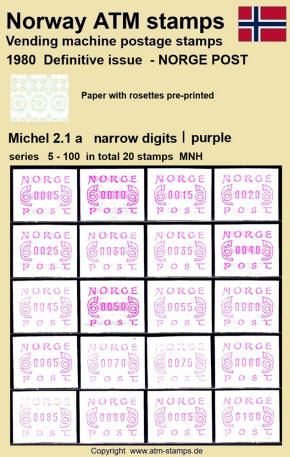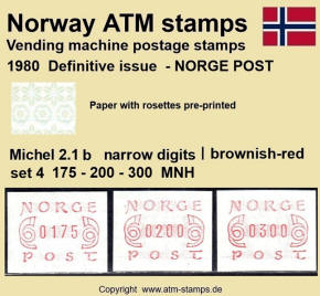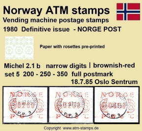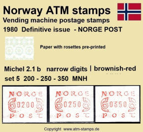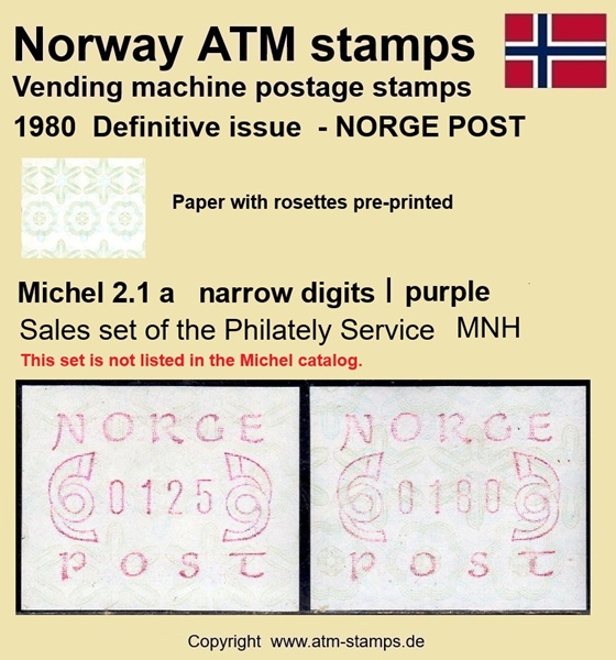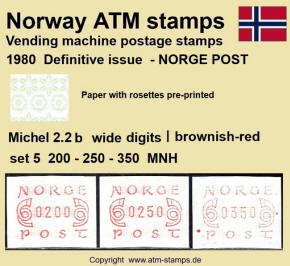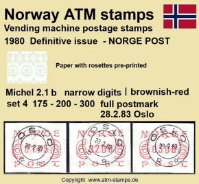 Die norwegische Post hat am 02.12.1980 eine neue Automatenmarke eingeführt. Neben einem neuen Druckklischee, jetzt ohne Automatennummern, wurde auch ein neues Papier mit einem Vordruck in Form von Rosetten in grünlich/bläulichen Farben verwendet. Das neue Druckklischee sowie auch das Rosettenmuster für das Papier wurden von dem bekannten norwegischen Briefmarkendesigner Knut Løkke-Sørensen entworfen. Die Papierrollen mit dem Rosettenmuster wurden von der Firma Rasch & Co. in Sofiemyr im Buchdruckverfahren hergestellt. Die Rollen hatten eine Druckverstärkung des Vordruckes, die auf jeder Rolle am Rollenende in zwei Formen vorkam. Zuerst erfolgte eine dunkelgrüne und nach ca. 6 weiteren Marken eine kräftig türkisfarbene Verstärkung des Rosettenaufdrucks. Ab dem Ersttag waren landesweit insgesamt 30 Automaten von Typ FE264 der schweizer Firma Frama in Betrieb, davon waren neben den ehemals 5 Versuchsautomaten auch 25 neue Geräte. Im laufe des Jahres 1981 wurden dann noch weitere 5 neue Automaten in Betrieb genommen. Am Ersttag, den 02.12.1980 waren von den 30 Geräten zwölf mit lila (a) und 18 mit braunrotem (b) Farbband ausgestattet. Mit der Einführung neuer braunroter Farbbandkasten im Frühjahr 1982 wurden die lila Farbbänder aus dem Verkehr gezogen und durch die neuen braunroten ersetzt. Die Automaten hatten ein Wertespektrum von 5 bis 99,85 (?) Øre in Stufen von 5 øre sowie einen einprogrammierten Tastensatz mit 3 Wertstufen 100, 125, 130 (Øre) wohingegen am Standort Oslo Lufthavn (ehemals Versuchsautomat Nr.2) die Werte 100, 125, 180 (Øre) programmiert waren. Ab ca. Oktober 1984 wurden, ohne Ankündigung der Post, in einigen Geräten die Druckwerke ausgetauscht. Dabei wurden leicht geänderte Zifferntypen in den neuen Druckwerken eingesetzt die etwas breiter (2.2) sind als die bisher eingesetzten schmalen (2.1) Zifferntypen.