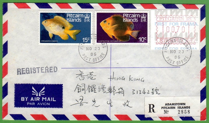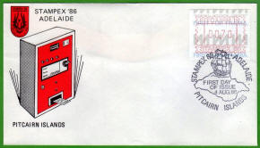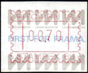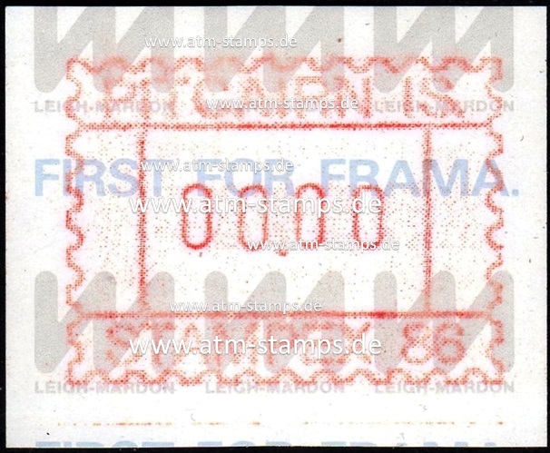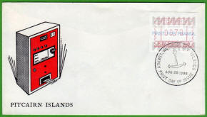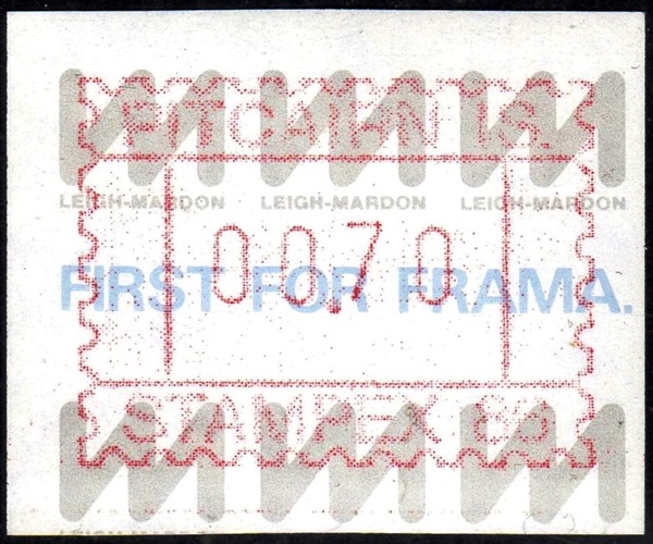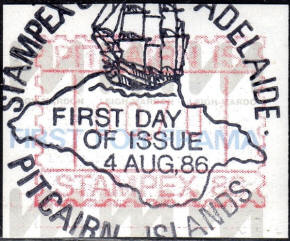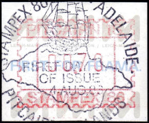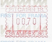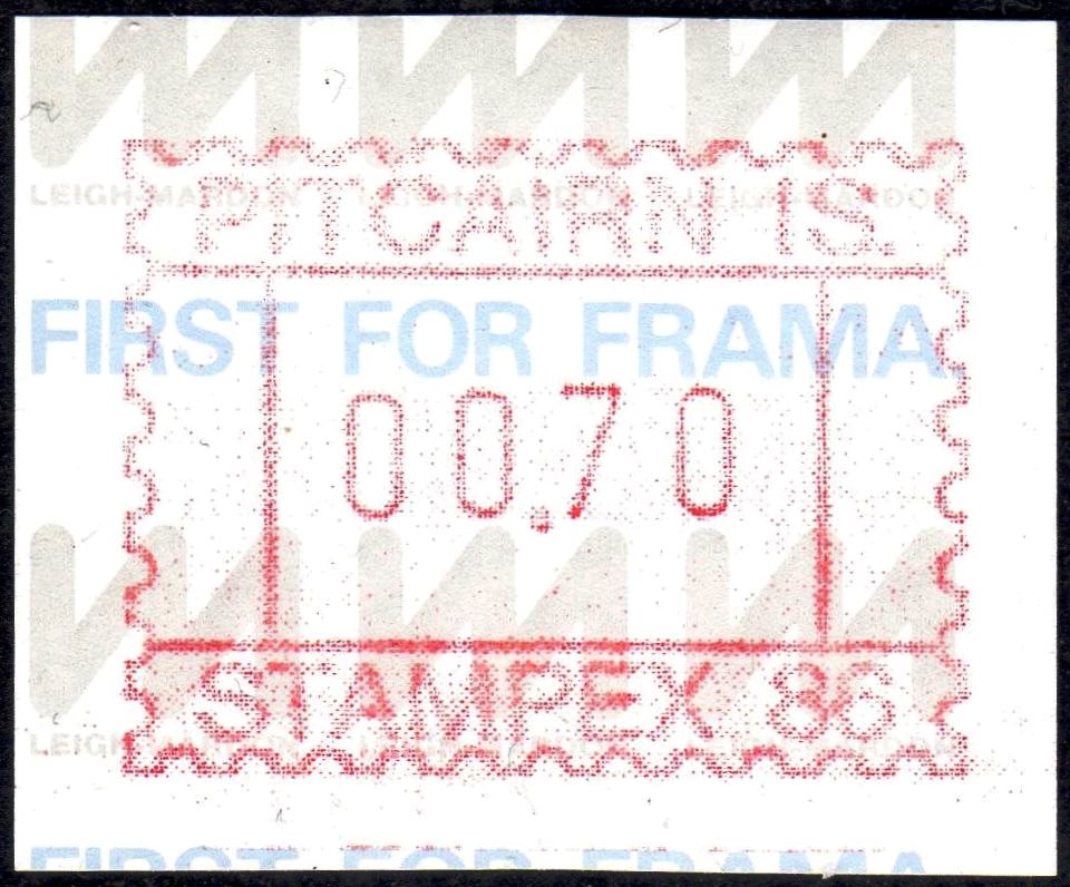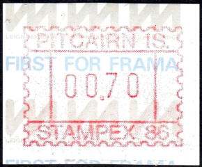 Der einzige Ortsautomat dieser Ausgabe war während der Briefmarkenausstellung STAMPEX 1986 in Adelaide (Australien) am Stand der Postagentur für Pitcairn in Australien aufgestellt. Der Automat vom schweizer Hersteller Frama Typ FE121 akzeptierte die zwei australischen Münzen 50 Cents und 1 Dollar (Australien-$), die am Display des Automaten als 0.70 bzw. 1.40 Neuseeland-Dollars (die Währung auf Pitcairn) angezeigt wurden. Nur der Direktwahlknopf ganz links war programmiert und mit 70 Cents beschriftet. Auf Knopfdruck gab der Automat die einzige Wertstufe 70 Cents ab. Beim verwendeten Vordruckpapier mit dem Aufdruck FIRST FOR FRAMA und dem Firmenlogo LEIGH-MARDON handelt es sich um Werberollen der australischen Briefmarkendruckerei Leigh-Mardon, die ohne Erlaubnis der Druckerei verwendet wurden. Der FRAMA-Automat war nur gemietet und wurde nach der Ausstellung an den FRAMA-Agenten in Australien zurückgegeben. Auf Pitcairn selbst war kein Automat installiert. Die Versandstelle lieferte diese Ausgabe inklusive amtliche FDC. Der 28.8.1986 war das erstmögliche Stempeldatum auf Pitcairn, da die Inselgruppe nur per Schiff zu erreichen war. |