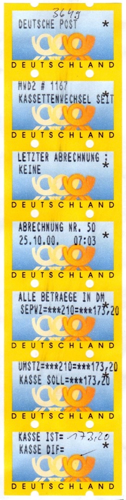 DEUTSCHE POST 7er-Streifen - Kassenwechsel seit letzter Abrechnung: postalisch verwendet, handschriftliche Vermerke. |