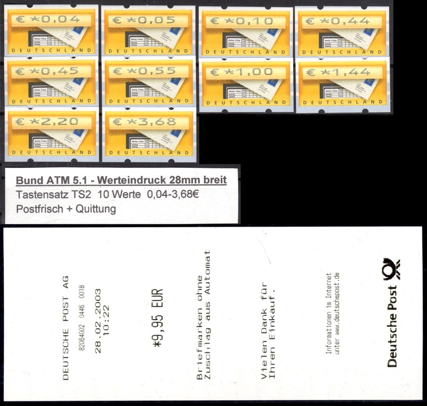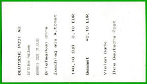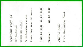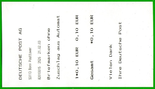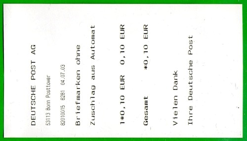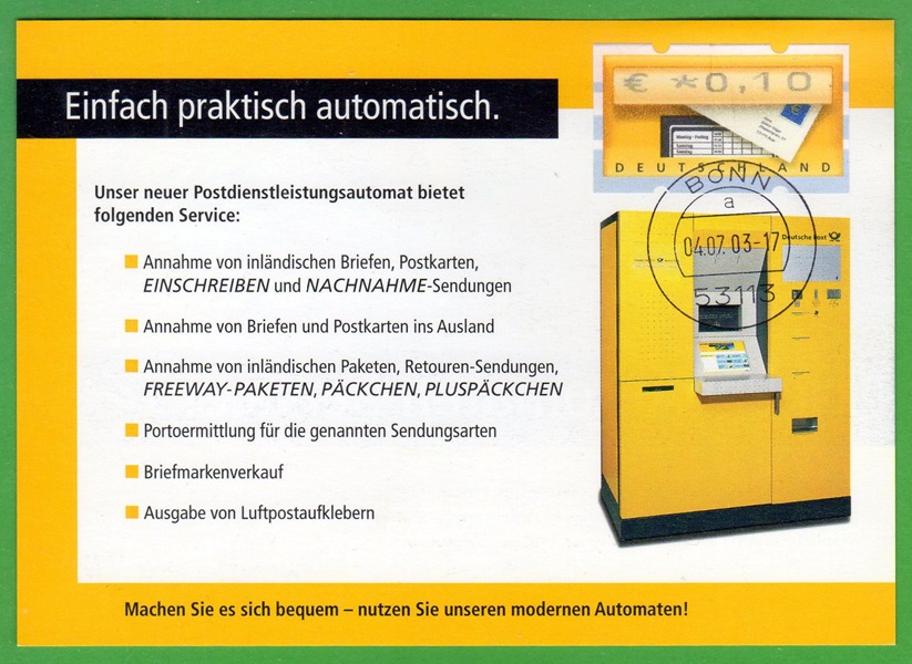 Werbekarte mit ATM 0,10 Rundstempel 04.07.03 Bonn mit Quittung |