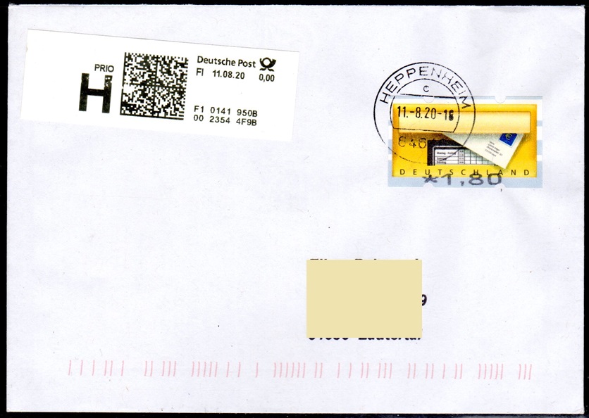 Standard Prio Brief 1,80 mit roter Postkodierung - Rundstempel 11.8.20
