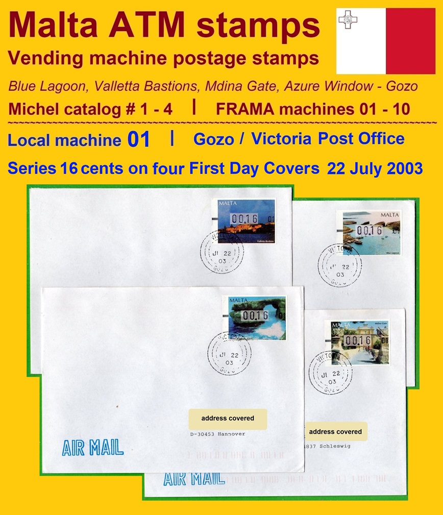 ATM 01 - serie 00.16 - 4x FDC Victoria Gozo 22.07.2003 |